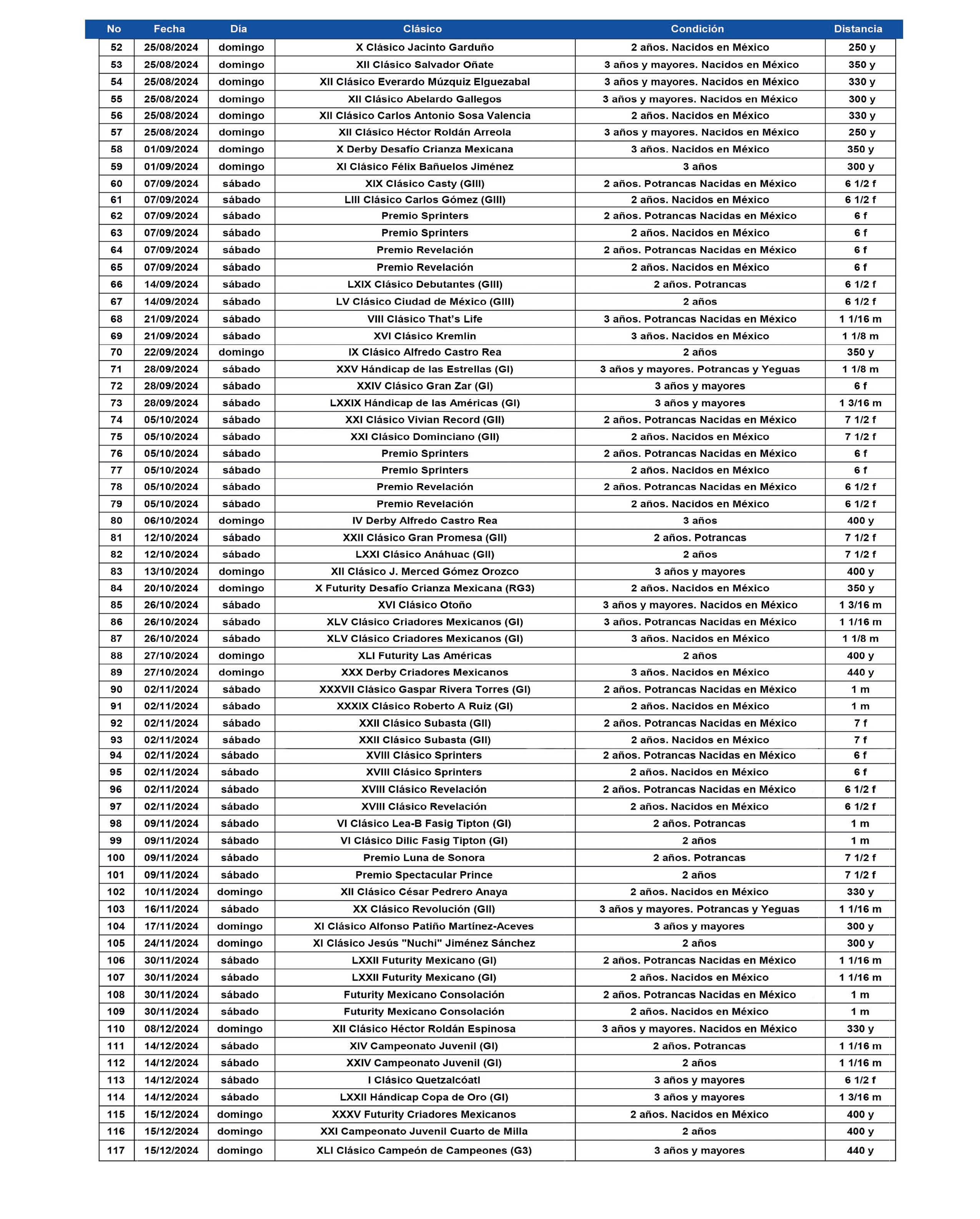 CARRILES 12 Calendario de Clásicos Cuarto de Milla - Temporada 2024 13 Clásicos Cuarto de Milla en el Hipódromo de las Américas 16 En el Derby México, premio al esfuerzo para BR Chivali Nazareno