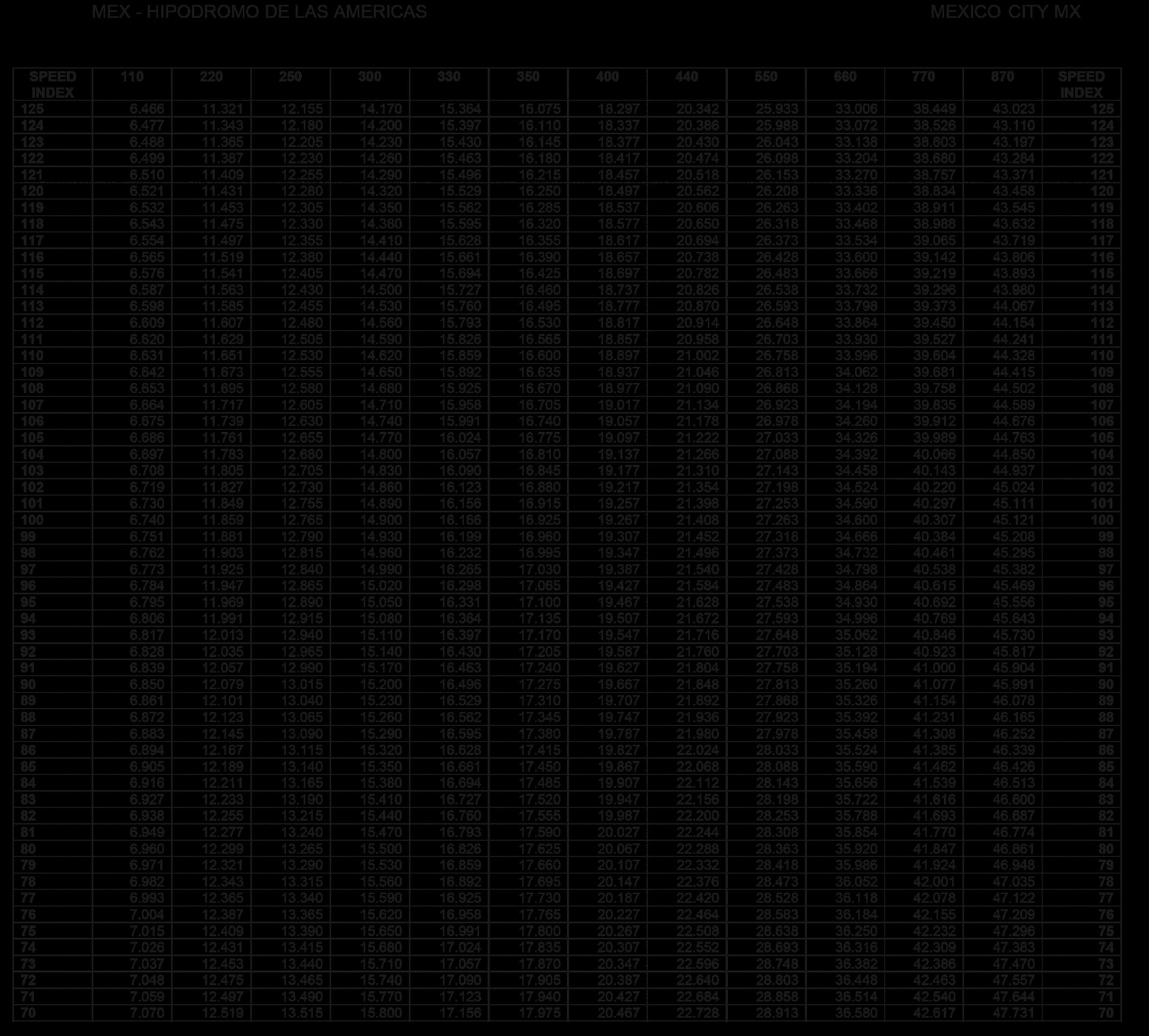 La siguiente Tabla es la que estará vigente para la Temporada 2024 en el Hipódromo de las Américas. La AQHA elabora la tabla a partir del SI-125 hasta el SI-25, pero por razones de espacio solamente la incluimos hasta el SI-70.