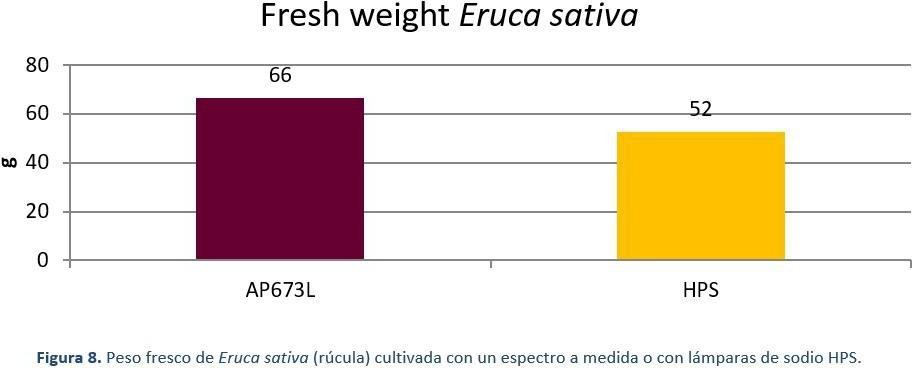Rocket plants (Figure 7) grown under 125 μmol/m2.s (photoperiod 18 hours) under two different light sources, Valoya AP673L LED light source and a traditional High Pressure Sodium (HPS) light source, were measured by their fresh weight, leaf phenolic content, and leaf nitrate content at the end of the 28-day production cycle. Under the AP673L spectrum, the plants had 26% more fresh weight than plants grown under HPS light (Figure 8). The leaf total phenolic content, which is an indicator of taste and antioxidant compounds accumulated in the leaves was 88% higher under AP673L treatment compared to HPS treatment (Figure 10). As for the accumulation of nitrates in the leaves, rocket plants grown under HPS had a 30% higher nitrate content compared to the plants grown under the AP673L spectrum (Figure 9). As proven with the rocket experiment, the advantages in cultivation with tailored spectrum cannot only be rated by the increase in