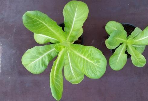 Figure 5 A. Lettuce plants, the left shows the grown plant with LED lighting adapting its spectrum to the best photosynthesis (T1) in comparison with the one in the right adapting to a standard LED light (T0).