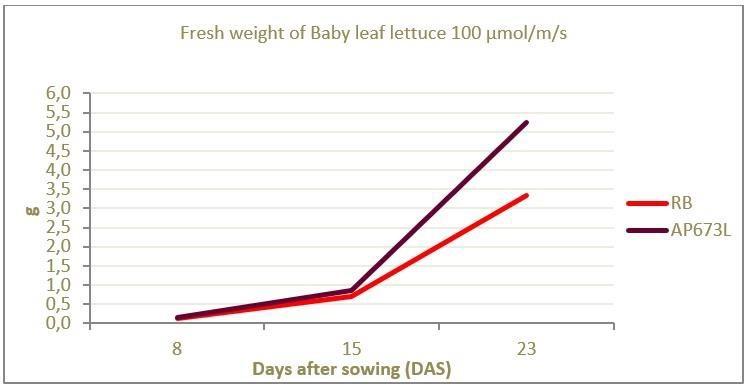In an experiment carried out with baby leaf lettuce using 100 μmol/m2.s between a tailored spectrum (AP673L) and typical red and blue LED light source, an increase of 58% in biomass was observed in the plants grown under the tailored spectrum (Figure 16). In addition, it was noted that the plants grown under the continuous spectrum had a balanced growth performance; hypocotyls were not elongated, the number of leaves was greater compared to the RB light source and the leaf area of individual leaves was larger (Figure 17).