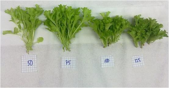 In figure 18, data from a trial conducted with lettuce variety ‘Multiblond’ grown under different intensities is presented. In this experiment the light spectrum for all treatments was the same, only the light intensity varied between 50 and 125 μmol/m2.s. The data shows that the higher the light intensity was, the more compact the plants were, and the lower the fresh weight was. However, fresh weight did not increase if light intensity was below 75 μmol/m2.s. A picture of the plants grown under the different light intensity treatments is presented in Figure 19.