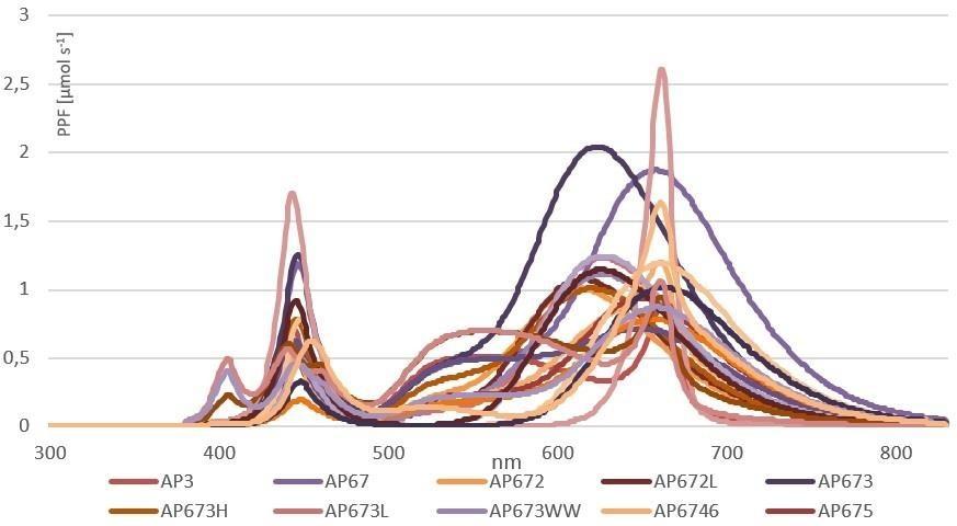 The approach for using only red and blue LEDs is based on matching the LED spectrum to the absorption curve of chlorophyll and that the good match would result in maximum photosynthesis and growth. However, as plants also have pigments which absorb wavelengths other than red and blue and the wavelengths beyond the PAR area can significantly affect the morphology and metabolism of plants, a light source that contains only blue and red is proven to be deficient. The development of a perfect growth spectrum takes a long time, and the results are based on experimental research. In Figure 3, a few spectra designed for different plant species and specific growth stages are presented.