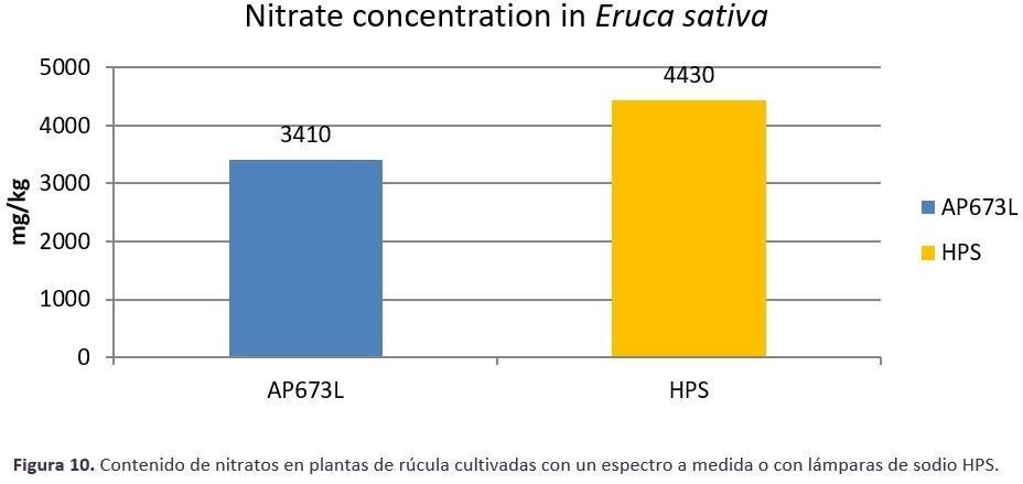 Figure 9 Nitrate content (mg/kg in fresh biomass) in rocket leaves grown under a vegetative growth spectrum AP673L (blue bar) and HPS light source (yellow bar). Plants received 125 umol/m/s of light, photoperiod was set to 18h.
