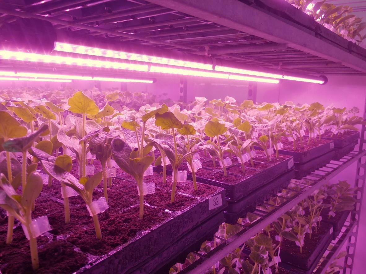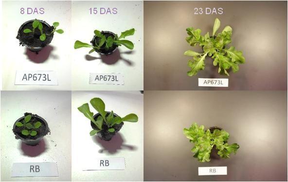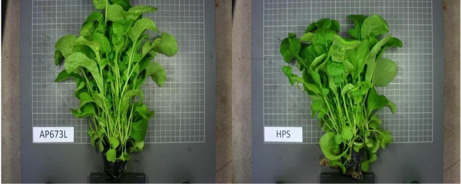 Figure 3 Rocket plants cultivated with customized spectra for biomass accumulation, AP673L, (left) and with HPS sodium lamps (right). Plants received 125 umol/m/s of light, photoperiod was set to 18h.