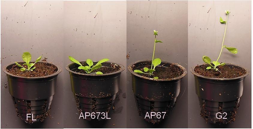 Figure 2 Arabidopsis plants grown under fluorescent light (FL), vegetative growth spectrum (AP673L), flowering spectrum (AP67) and a flower induction spectrum (G2). Spectra differ from each other by their R:FR and B:G ratios. All light treatments had a light intensity of 40 umol/m/s and photoperiod of 18 hours.