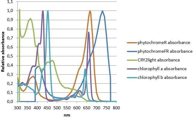 In addition to the photosynthesis process which provides energy for biomass production, flowering, seed development, and other functions such as germination, time of flowering and plant morphology are light dependent activities. These actions are highly related to the surrounding light quality from which the plant perceives signals of its environment. These responses are mediated by wavelengths within and beyond the PAR area, including also UV and far-red irradiation. The absorption curves for phytochromes, cryptochrome and chlorophylls are presented in Figure 1.