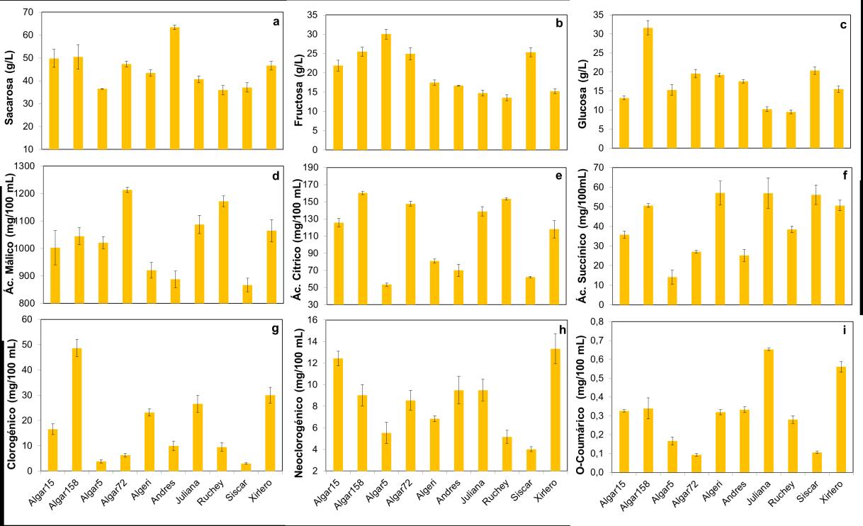 Figura 2. Azúcares individuales (sacarosa (a), fructosa (b) y glucosa (c)); ácidos orgánicos (málico (d), cítrico (e) y succínico (f)) y compuestos fenólicos (ácido clorogénico (g), neoclorogénico (h) y orto-coumárico (i)) de 10 cultivares de níspero. Las barras verticales representan los intervalos de diferencia mínima significativa (LSD) (p ≤ 0,05)