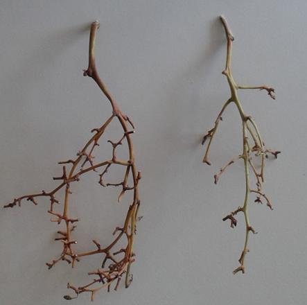 La deshidratación del raspón se produjo progresivamente a lo largo del ensayo, siendo mucho más evidente en las muestras control que las muestras con tomillo, llegando a día 35 estas últimas con el raspón mucho menos deshidratado y manteniendo el color verde, aunque no tan intenso como al inicio del ensayo (Figura 3).
