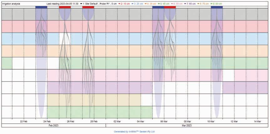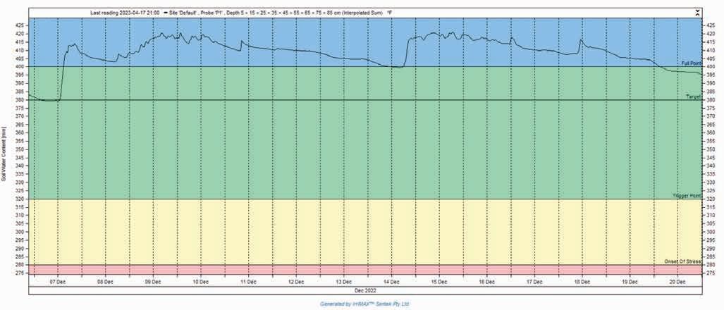 Figure 5 A graph from Irri-MAX™ displaying the rainfall (top pane, provided by Meteoblue) and the Volumetric Ion Content (VIC) measured by the sensors at the 15cm (black), 45cm (red) and 85cm (blue) depths in a Bay of Plenty kiwifruit orchard