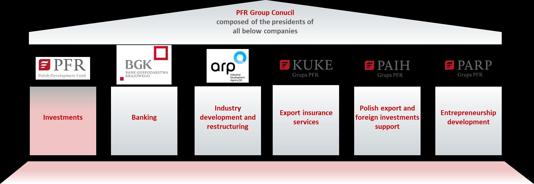 Based on the Act of 4 July 2019 on the Development Institutions System (the SIR Act), PFR is a member of the broader PFR Group which comprises all the major Polish development institutions, i.e., the Polish Development Fund (PFR), Bank Gospodarstwa Krajowego (BGK), the Industrial Development Agency (ARP), the Export Credit Insurance Corporation (KUKE), the Polish Agency for Enterprise Development (PARP), the Polish Agency of Trade and Investment (PAIH) as well as their subsidiaries. PFR Group is a federation of Polish development institutions. As the CEO of PFR serves as the Chairman of the Council of the PFR Group, PFR plays a leading role and coordinates activities of other members.
