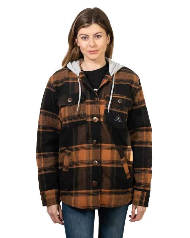 Campera tipo Alask a, de colores ladrillo y negro. La tela ex terior es de paño, y la tela del forro del cuerpo es de corderito sintético.