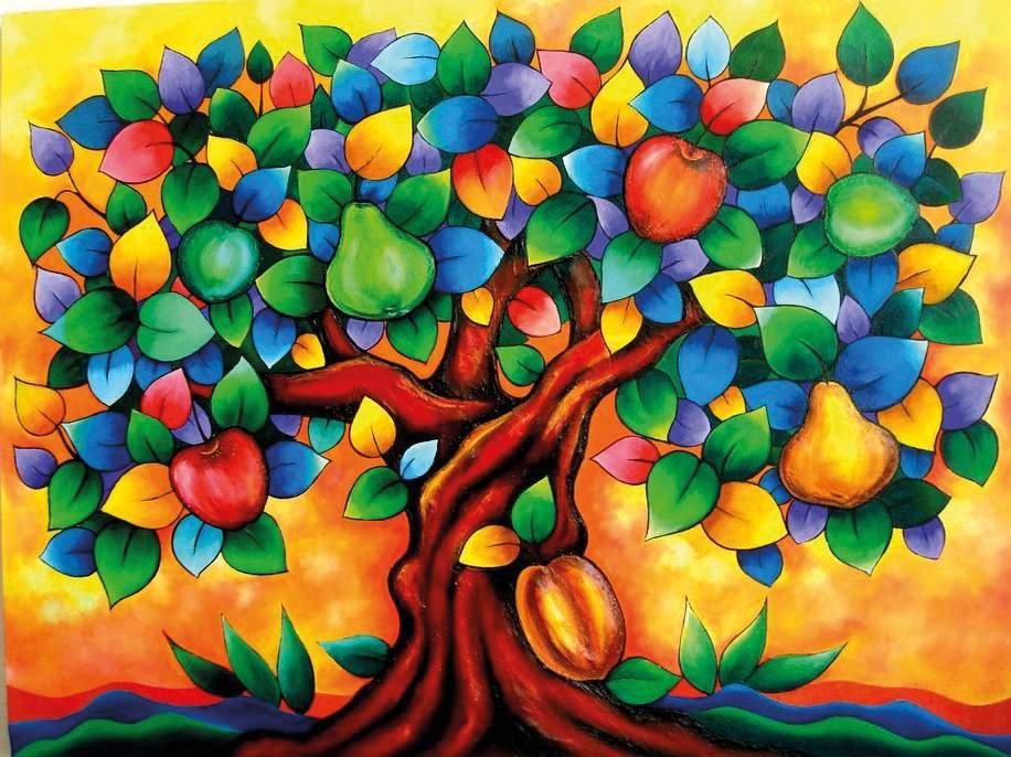 Empezamos por la obra más cercana en el tiempo, El árbol de la vida del ecuatoriano Manuel Augusto Peña Carrasco. Lo primero que nos llama la atención es su colorido, al punto que, tanto como un árbol que da frutos nos parece un árbol que da colores. Reconocemos algunos de los frutos: manzanas, membrillos, peras, lo importante es que no todos los frutos se ajustan al color convencional que les corresponde, más bien lo que importa es destacar la autonomía de los colores y la correspondencia que hay entre ellos. Sobre todo nos llama la atención el uso de colores primarios y secundarios muy vivos e intensos.