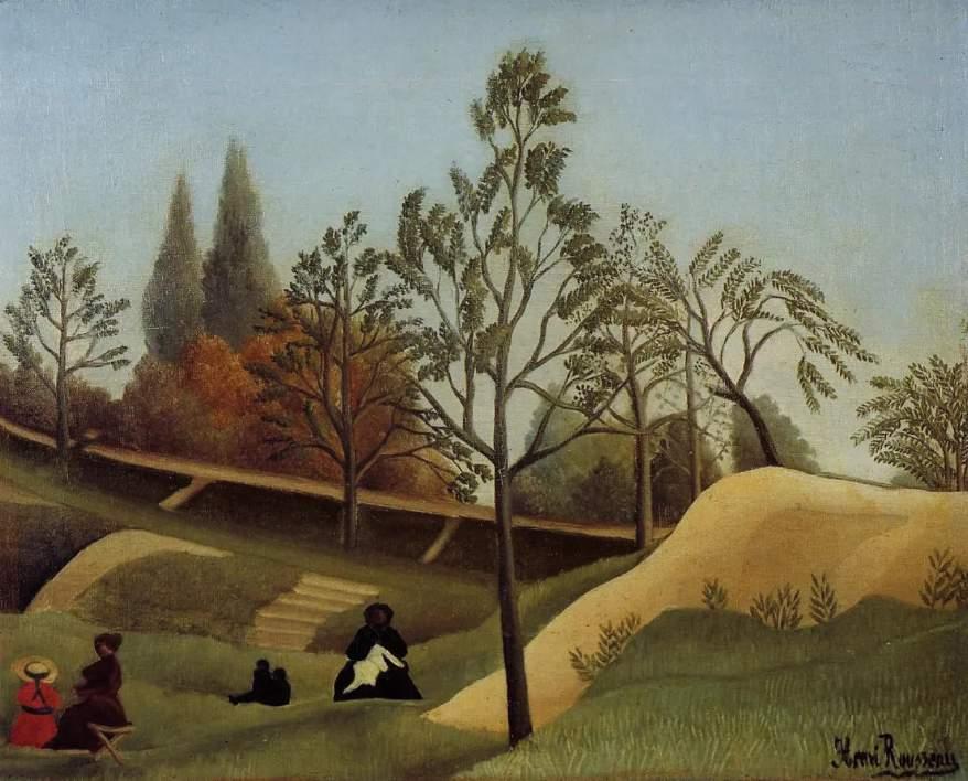 remolino. Van Gogh nos presenta un paisaje lleno de movimiento y sentimos incluso que el viento llega a nosotros desde el cuadro. En la pradera, de Henri Rousseau, por el contrario es, a diferencia del paisaje de Van Gogh, muy sereno y ordenado. Esa serenidad la transmite la composición misma del cuadro en que el árbol ocupa el eje central de simetría, dividiendo el espacio en proporciones iguales. Es un paisaje más civilizado que el de Van Gogh, más intervenido por las personas, como un paseo que invita a ser recorrido. Podemos ingresar desde el extremo izquierdo siguiendo el caminito que se inclina levemente hacia le derecha, de allí bajar por una de sus pendientes, y luego la escalera de fondo, y al fin llegar al área de reposo, en la que los personajes parecen estar descansando y compartiendo la tarde. Los personajes están representados por pequeñas siluetas oscuras, que contrastan con los verdes del paisaje.Llama la atención sobre todo la niña de rojo, de espaldas, ubicada en el extremo inferior izquierdo del cuadro. También la señora de sombrero y vestido largo y negro, que pareciera que estuviera tejiendo. El árbol central ordena el espacio, y a sus lados se ubican otros árboles, laterales, que ocupan un segundo plano y se ubican a igual distancia del central. Solo un árbol de fondo, inclinado a un extremo rompe el ritmo vertical y la simetría, y juega rítmicamente con las figuras más onduladas como las lomas o los senderos de arena. Henri Rousseau fue un célebre pintor francés, uno de los máximos representantes del arte naíf. Ridiculizado por la crítica en su época, fue sin embargo reconocido por su talento autodidacta y calidad artística, ejerciendo gran influencia en varios artistas de vanguardia.