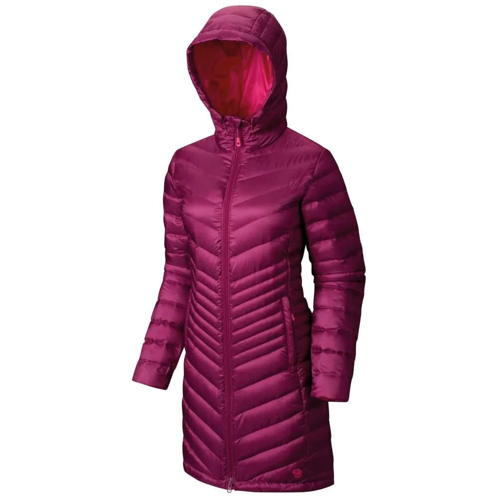 Campera Pluma Mountain para mujer, color uva, con interior rojo, con capucha ajustable y bolsillos laterales