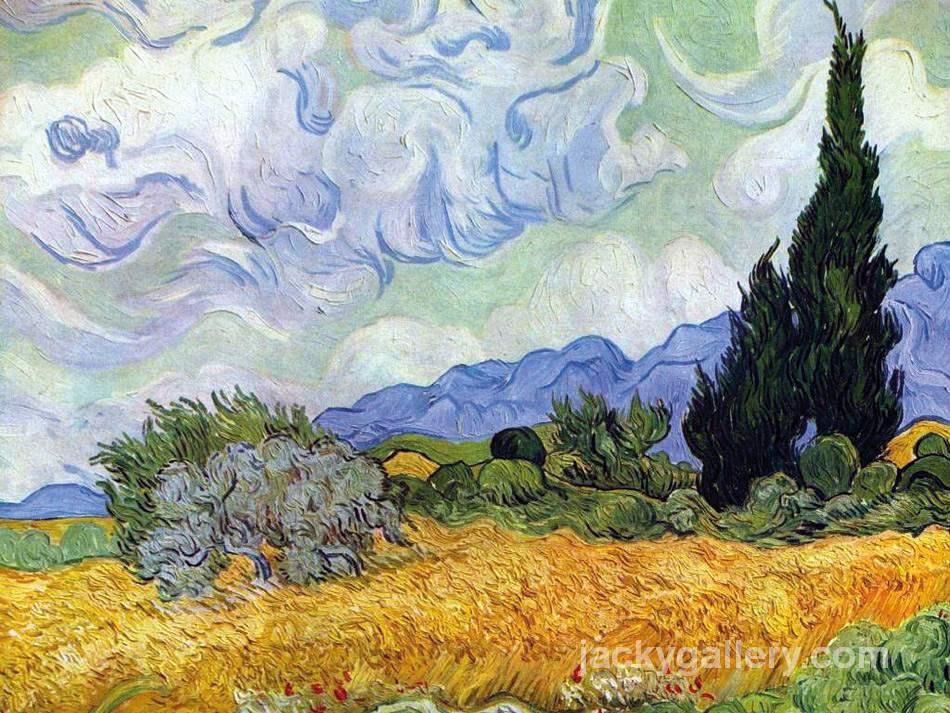 En la pintura podemos ver en primer plano el campo de trigo y el gran ciprés, detrás, las montañas a lo lejos y un manto de nubes.Reconocemos como Van Gogh ordena las líneas horizontales: una primera hilera de amarillos de trigo, por encima y detrás un hilera de verdes más agrestes. Van Gogh alterna los verdes y amarillos en el plano horizontal y por contraste se destaca el ciprés, en un verde oscuro, atravesando de manera vertical la composición casi del extremo inferior al superior. Además Van Gogh fue capaz de mezclar dos gamas de colores completamente diferentes, los tonos fríos y los cálidos, ya que por encima del campo de trigo, la mitad superior del cuadro la conforman las montañas azules y el cielo ventoso y nuboso. Un gran protagonista del cuadro es el viento que mueve el follaje y el campo de trigo como un re-
