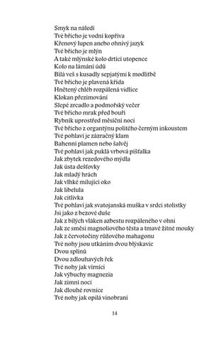 Smyk na náledí Tvé břicho je vodní kopřiva Křenový lupen anebo ohnivý jazyk Tvé břicho je mlýn A také mlýnské kolo drtící utopence Kolo na lámání údů Bílá veš s kusadly sepjatými k modlitbě Tvé břicho je plavená křída Hnětený chléb rozpálená vidlice Klokan přezimování Slepé zrcadlo a podmořský večer Tvé břicho mrak před bouří Rybník uprostřed měsíční noci Tvé břicho z organtýnu politého černým inkoustem Tvé pohlaví je zázračný klam Bahenní plamen nebo šalvěj Tvé pohlaví jak puklá vrbová píšťalka Jak zbytek rezedového mýdla Jak ústa dešťovky Jak mladý hrách Jak vlhké milující oko Jak libelula Jak citlivka Tvé pohlaví jak svatojanská muška v srdci stolistky Jsi jako z bezové duše Jak z bílých vláken azbestu rozpáleného v ohni Jak ze směsi magnoliového těsta a tmavé žitné mouky Jak z červotočiny růžového mahagonu Tvé nohy jsou utkáním dvou blýskavic Dvou splínů Dvou zdlouhavých řek Tvé nohy jak vírníci Jak výbuchy magnezia Jak zimní noci Jak dlouhé rovnice Tvé nohy jak opilá vinobraní 14