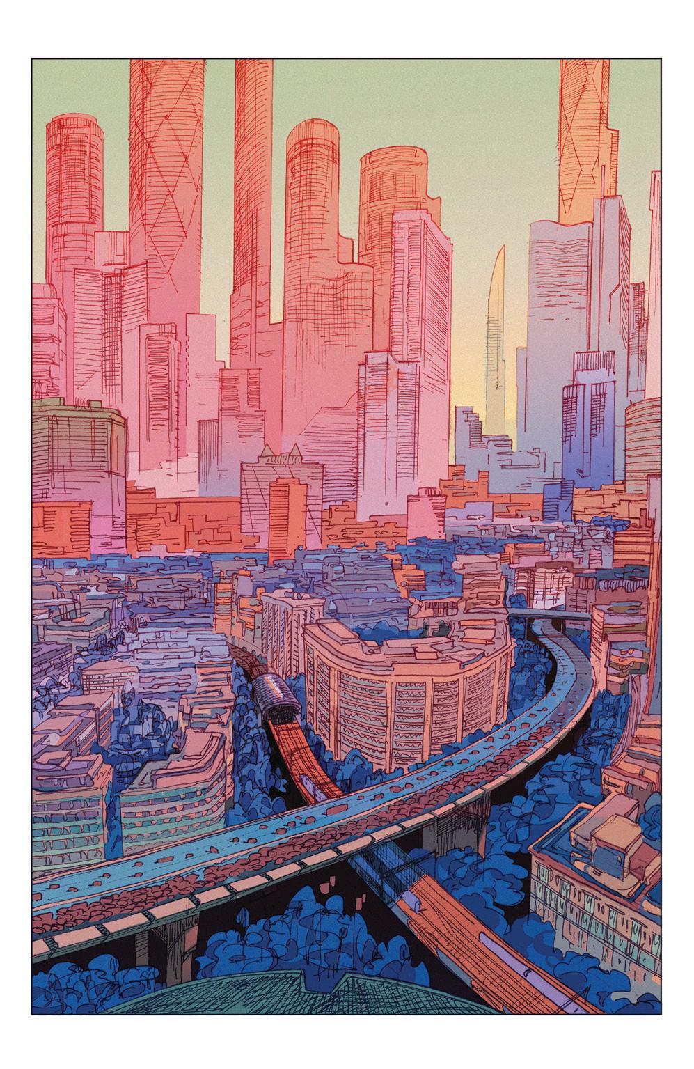 JEJÍ POHLED POD VLNKAMI HAVRANÍCH VLASŮ SE ZTRÁCÍ VE VZDÁLENÝCH SVĚTLECH MĚSTA A JEJÍ MYŠLENKY, PODOBNĚ JAKO CIGARETOVÝ KOUŘ, VÍŘÍ OKOLNÍM VZDUCHEM.