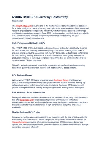 Hostrunway NVIDIA H100 GPU Server delivers powerful performance for AI, machine learning, and high-performance computing workloads. With GPU dedicated servers, bare metal GPU infrastructure, powerful GPUs, and flexible dedicated GPU pricing, businesses can run data-intensive applications efficiently while ensuring speed, scalability, and reliable hosting infrastructure for modern enterprise computing.
