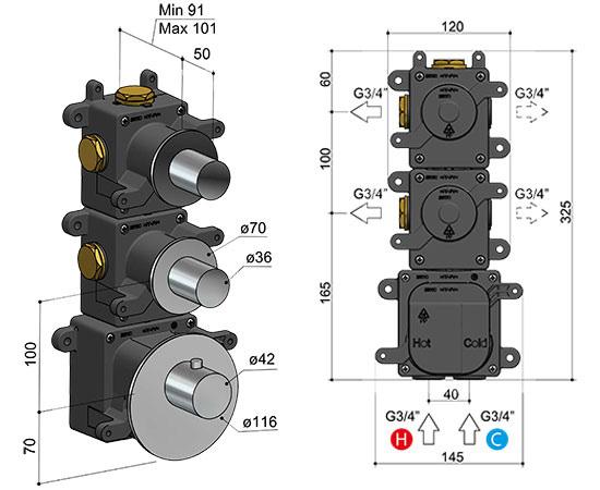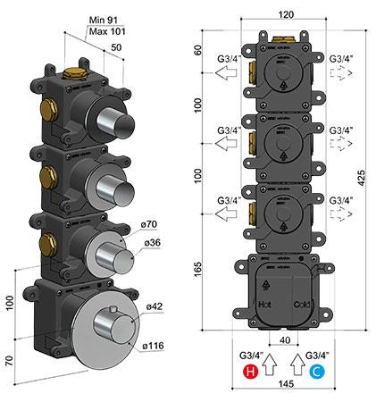 High Flow concealed thermostatic mixer, with 3 stop valves