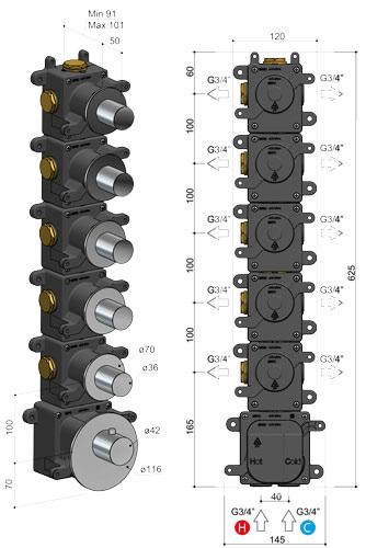 High Flow concealed thermostatic mixer, with 5 stop valves