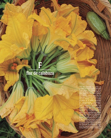 F flor de calabaza Flor de calabaza es, como su nombre lo indica, la flor que será fruto unos días después, si es que no la guisamos y disfrutamos antes. Es necesario quitarle el pistilo central para que no amargue. Generalmente, se cocina con cebolla y ajo, pero como es parte de la milpa mexicana, la encontramos comúnmente guisada con jitomate, chile, elote y calabaza, haciendo una combinación perfecta cargada de sabores contrastantes y muy nuestros. En combinación con estos otros ingredientes aporta una gran cantidad de vitaminas. Ha viajado por el mundo y, de hecho, los italianos (fiori di zucca) y los norteamericanos (zuchinni flower) la han integrado a su gastronomía en las últimas décadas. En Tlaxcala las rellenan de queso y las capean para convertirlas en las famosas indias vestidas.