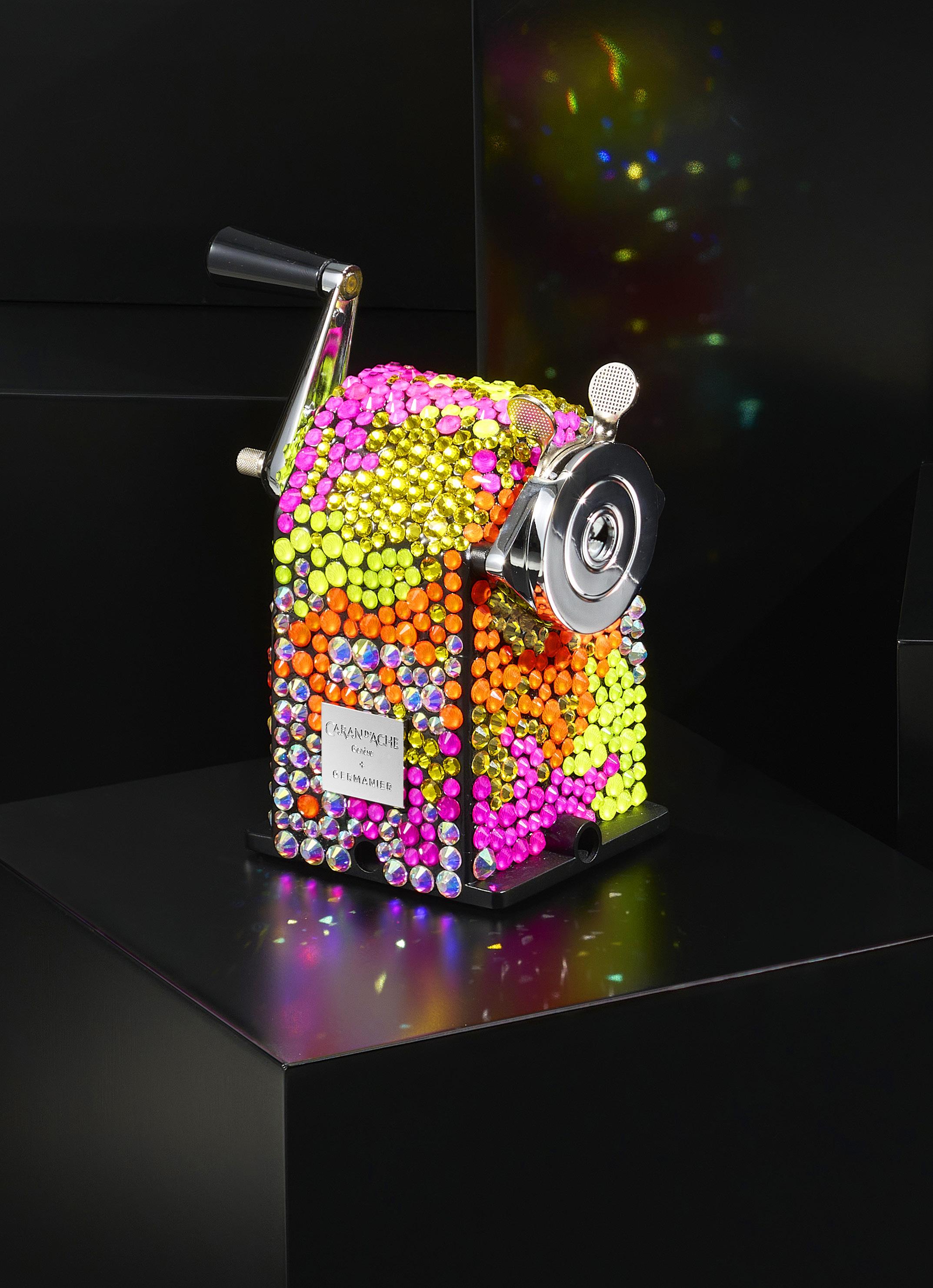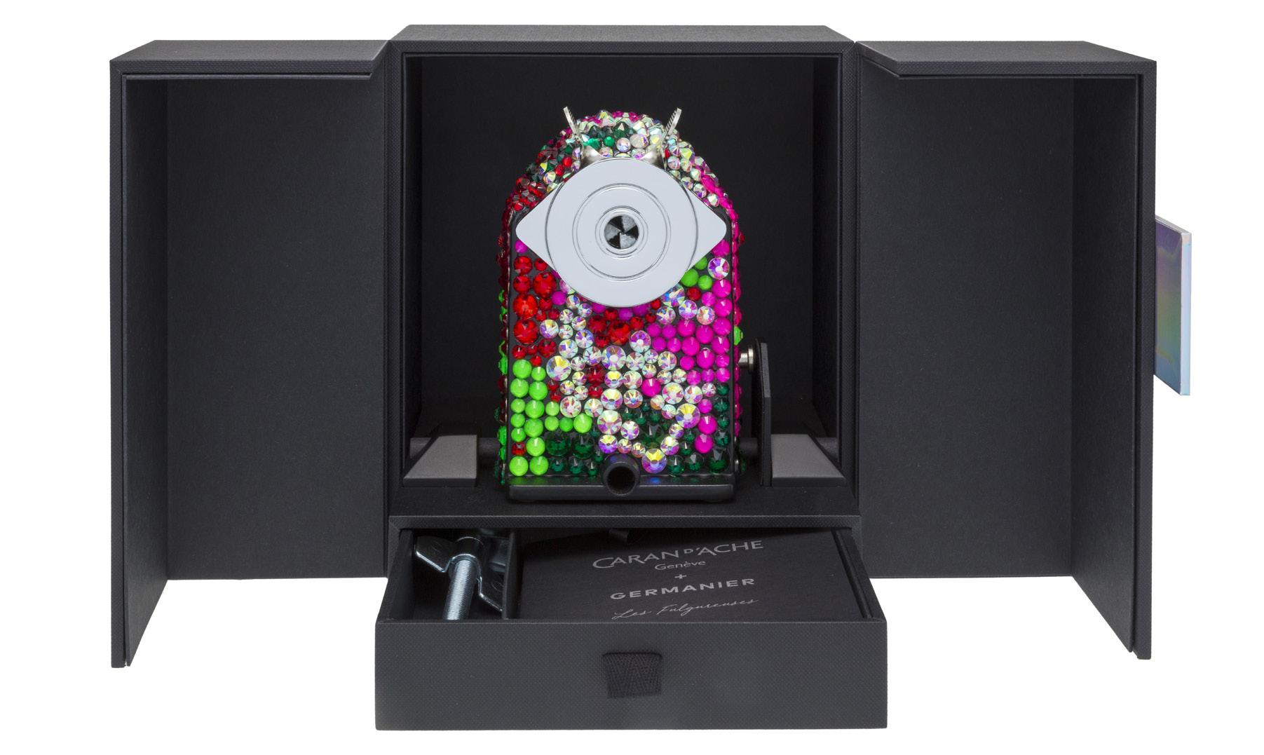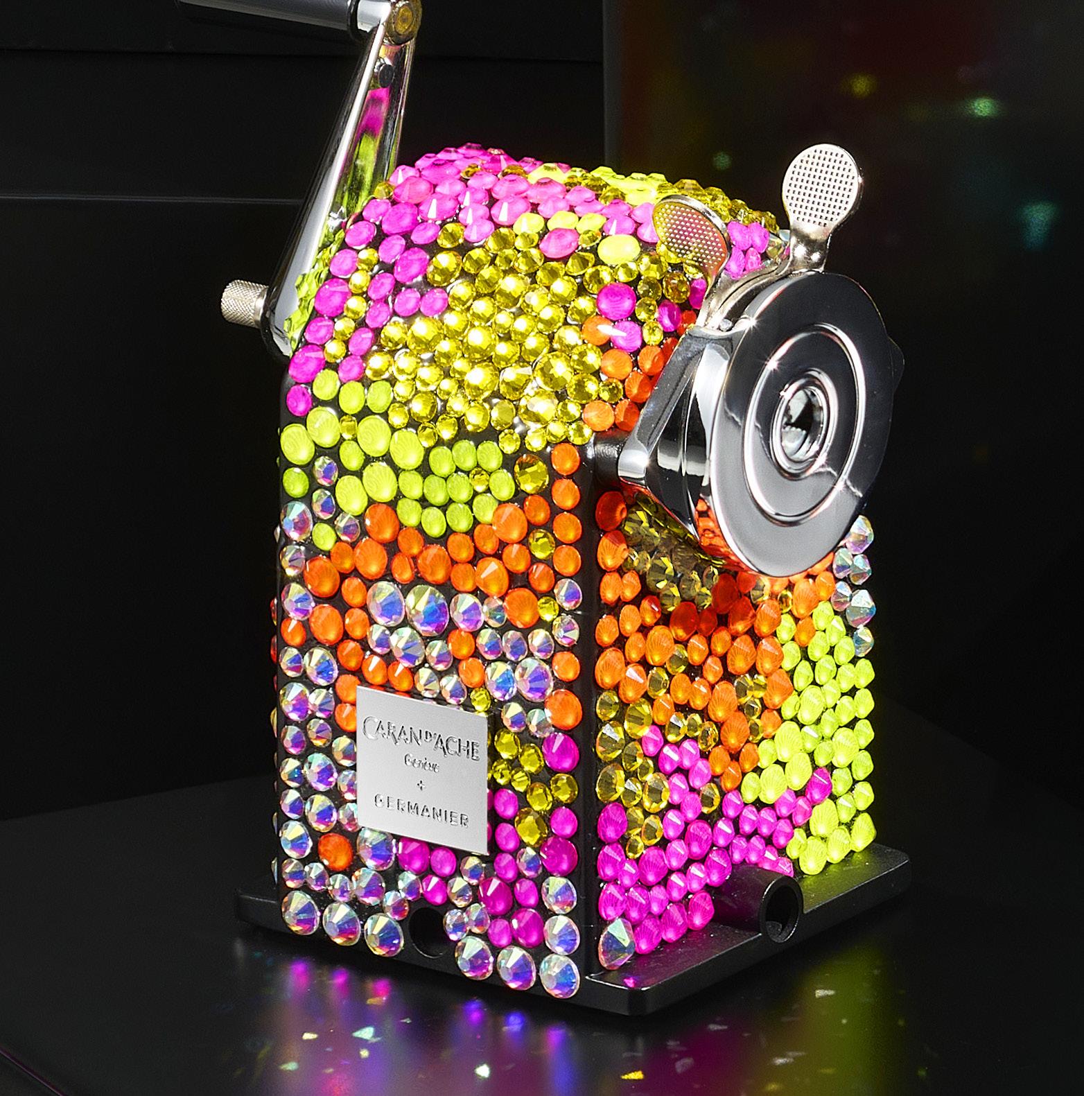 2910. Caran d’Ache & Germanier, Les Fulgureuses, Infra Rose, pièce unique, machine à tailler recouverte de 1000 cristaux de couleur rouge rubis, vert émeraude, ainsi que vert et rose fluo. Fourni avec la pièce d’exception: un certificat d’authenticité signé par Carole Hubscher, présidente de Caran d’Ache, et par Kévin Germanier, numérotée 1/1; un écrin sur mesure; une surboîte; serre-joint permettant de fixer à une table; tissus de nettoyage