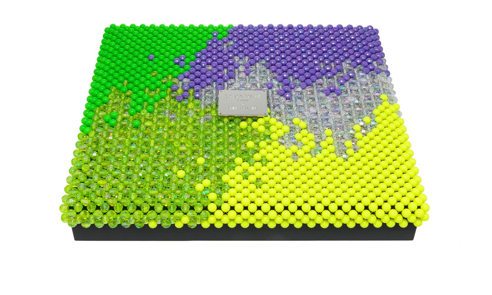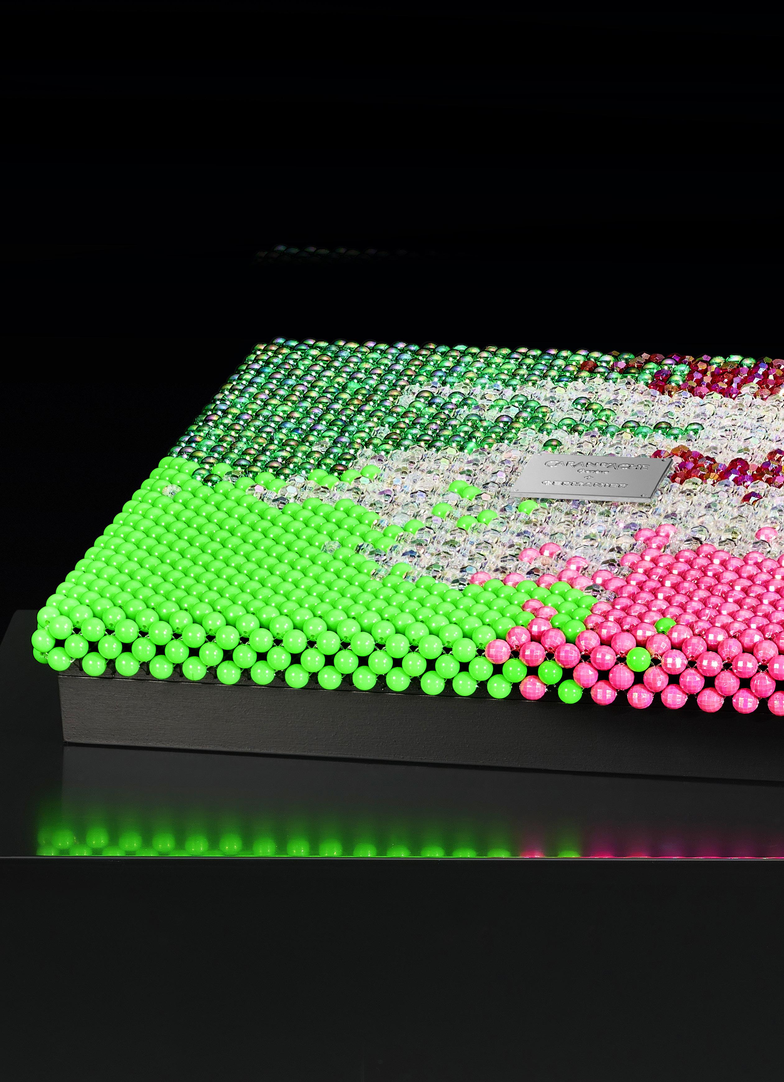 2909. Caran d’Ache & Germanier, Les Fulgureuses, Infra Rose, pièce unique, coffret de 120 crayons de couleur dans leur écrin sur mesure habillé de plus de 1500 perles tissées à la main de couleur rouge rubis, vert émeraude, ainsi que vert et rose fluo. Fourni avec la pièce d’exception: un certificat d’authenticité signé par Carole Hubscher, présidente de Caran d’Ache, et par Kévin Germanier, numérotée 1/1; écrin sur mesure; une surboîte; tissus de nettoyage