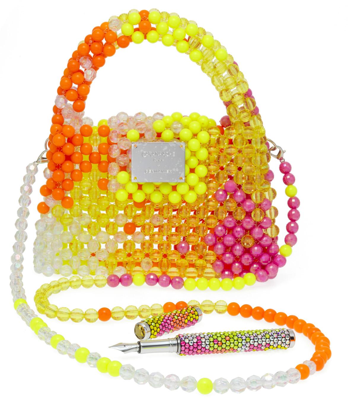 2902. Caran d’Ache & Germanier, Les Fulgureuses, Orange Acide, pièces uniques, ensemble composé d’un instrument de haute écriture, stylo plume serti d’une citrine taille brillant de 2.33 cts et de 528 cristaux accompagné de son sac assorti tissé de perles de couleur orange, jaune et rose fluo ainsi que jaune citrine avec bandoulière amovible. Fourni avec la pièce d’exception: un certificat d’authenticité signé par Carole Hubscher, présidente de Caran d’Ache, et par Kévin Germanier, numérotée 1/1; un certificat pour la citrine; un pochon noir revêtu de cristaux de verre; un écrin sur mesure; une surboîte; un tissu de nettoyage