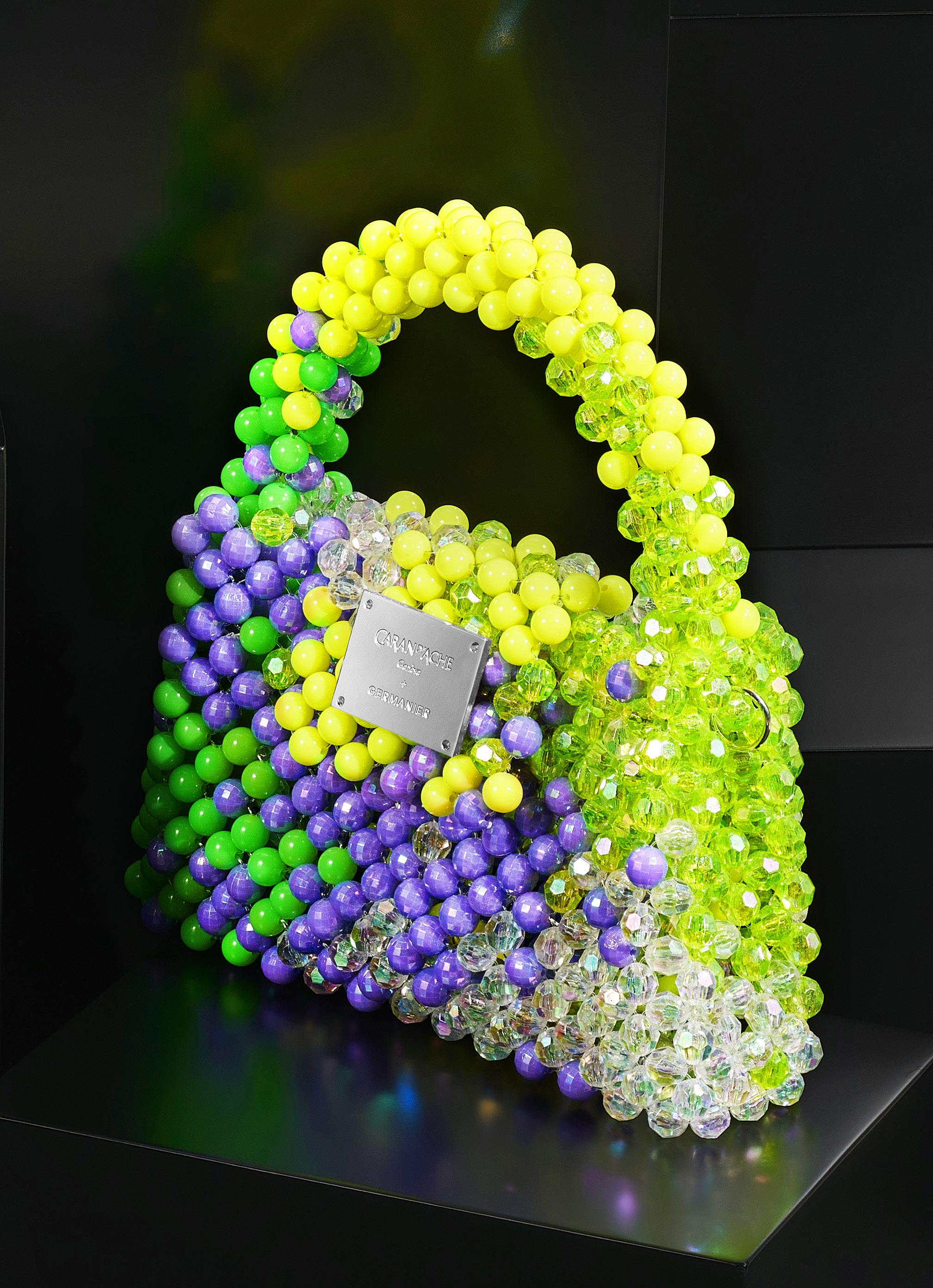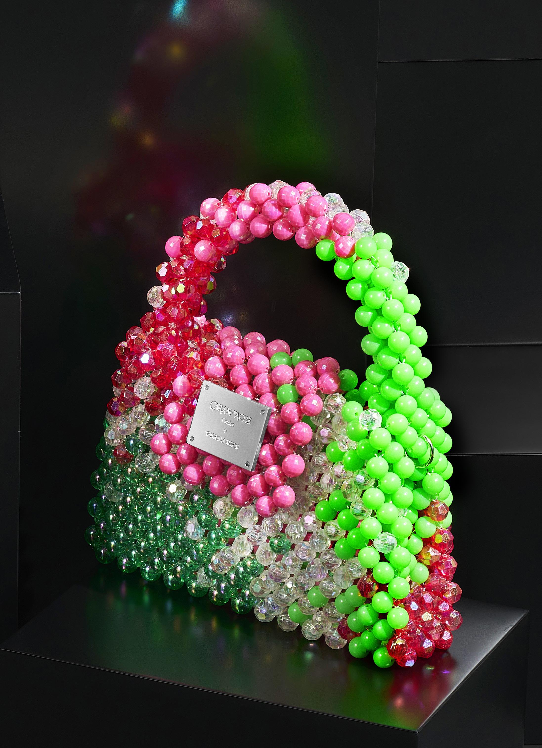 2908. Caran d’Ache & Germanier, Les Fulgureuses, Infra Rose, pièces uniques, ensemble composé d’un instrument de haute écriture, stylo plume serti d’une agate verte taille brillant de 2.59 cts et de 528 cristaux accompagné de son sac assorti tissé de perles de couleur rouge rubis, vert émeraude, ainsi que vert et rose fluo avec bandoulière amovible. Fourni avec la pièce d’exception: un certificat d’authenticité signé par Carole Hubscher, présidente de Caran d’Ache, et par Kévin Germanier, numérotée 1/1; un certificat pour l’agate verte; un pochon noir revêtu de cristaux de verre; un écrin sur mesure; une surboîte; un tissu de nettoyage