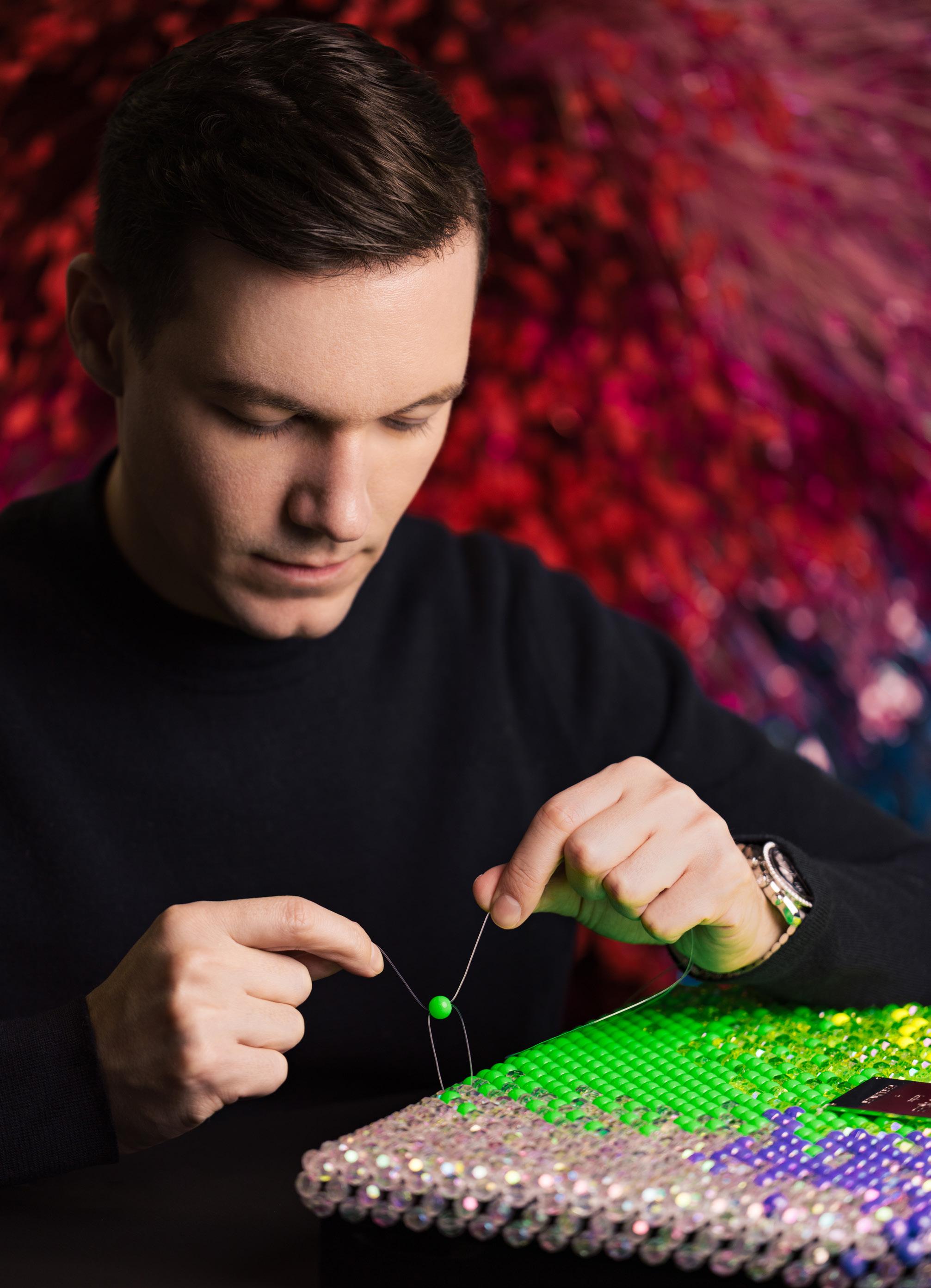 Fidèle à son esthétique, Kévin Germanier a associé des teintes fluorescentes à des nuances pastel ou plus profondes, ponctuées de perles aux reflets d’aurores boréales. Les perles et cristaux utilisés, signature du style Germanier, proviennent de stocks de matières déjà disponibles: ces matériaux upcyclés, présentant de subtiles irrégularités naturelles, variations de couleur, d’épaisseur ou de position, témoignent d’un travail artisanal pleinement assumé, sublimé par une démarche créative et engagée.