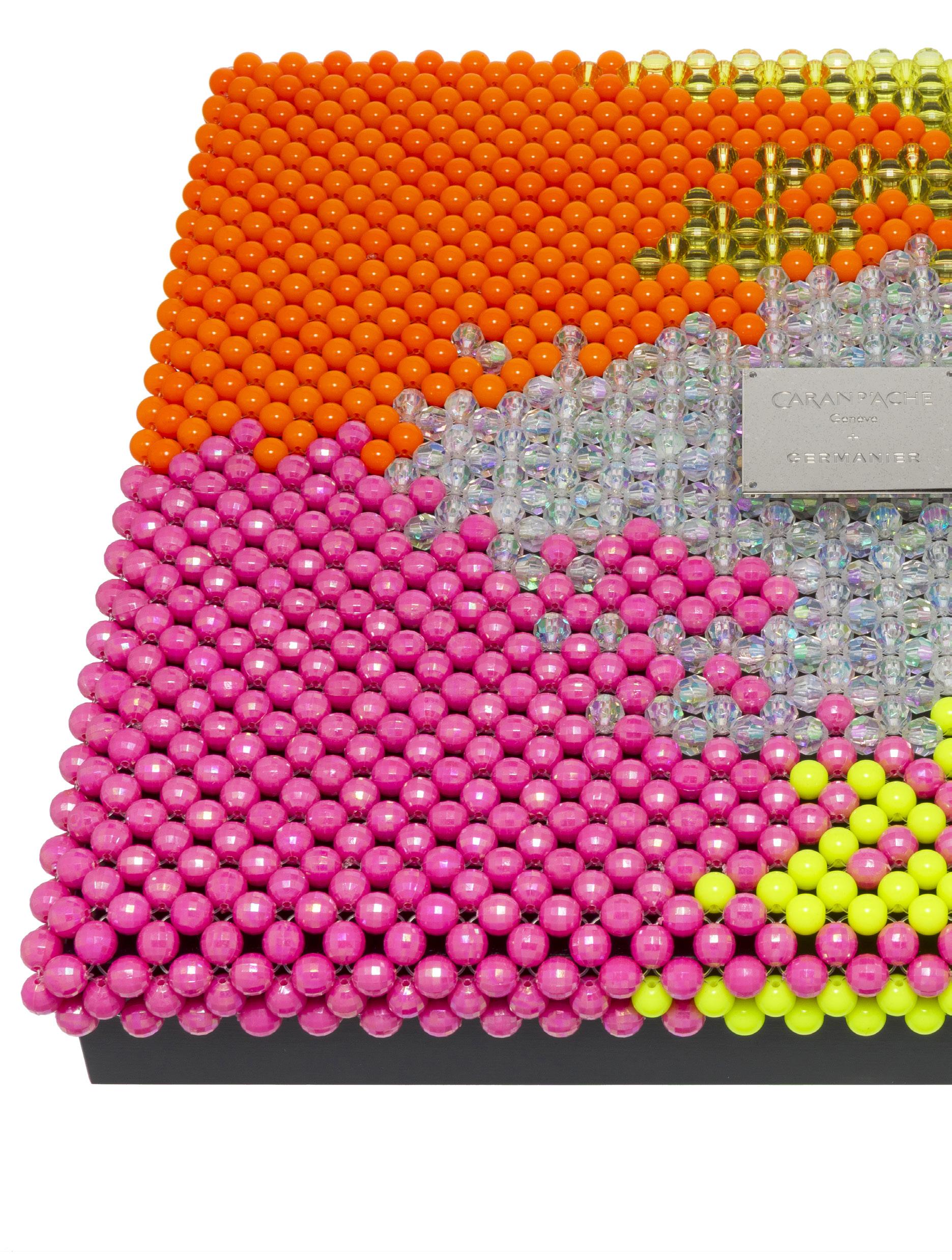 2903. Caran d’Ache & Germanier, Les Fulgureuses, Orange Acide, pièce unique, coffret de 120 crayons de couleur dans leur écrin sur mesure habillé de plus de 1500 perles tissées à la main de couleur orange, jaune et rose fluo ainsi que jaune citrine. Fourni avec la pièce d’exception: un certificat d’authenticité signé par Carole Hubscher, présidente de Caran d’Ache, et par Kévin Germanier, numérotée 1/1; écrin sur mesure; une surboîte; tissus de nettoyage