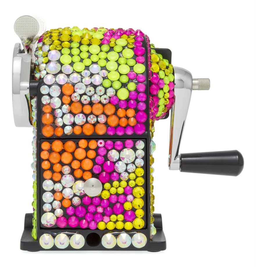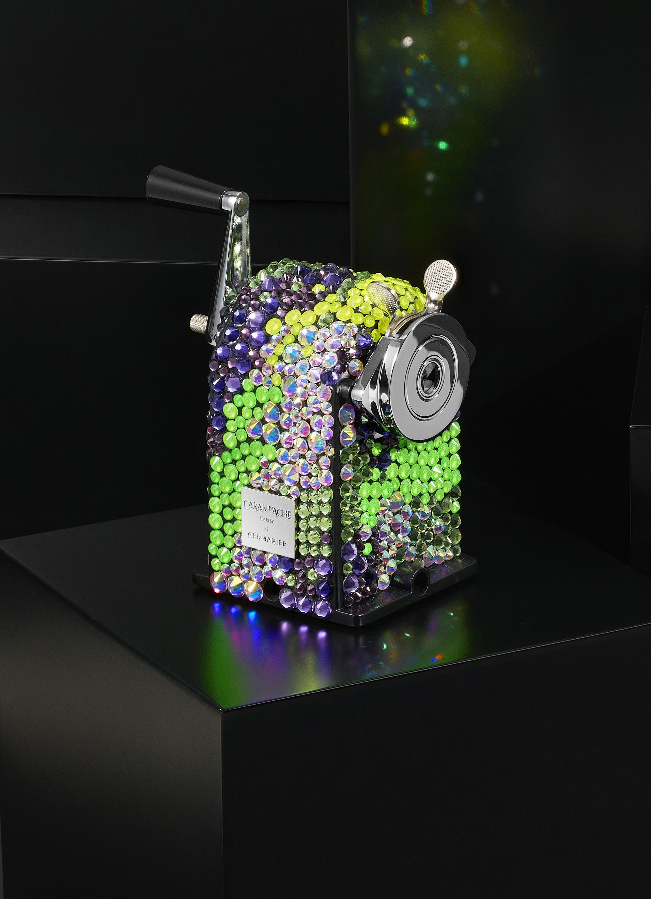 2907. Caran d’Ache & Germanier, Les Fulgureuses, Ultra Violet, pièce unique, machine à tailler recouverte de 1000 cristaux de couleur vert péridot, vert et jaune fluo, ainsi que mauve. Fourni avec la pièce d’exception: un certificat d’authenticité signé par Carole Hubscher, présidente de Caran d’Ache, et par Kévin Germanier, numérotée 1/1; un écrin sur mesure; une surboîte; serre-joint permettant de fixer à une table; tissus de nettoyage
