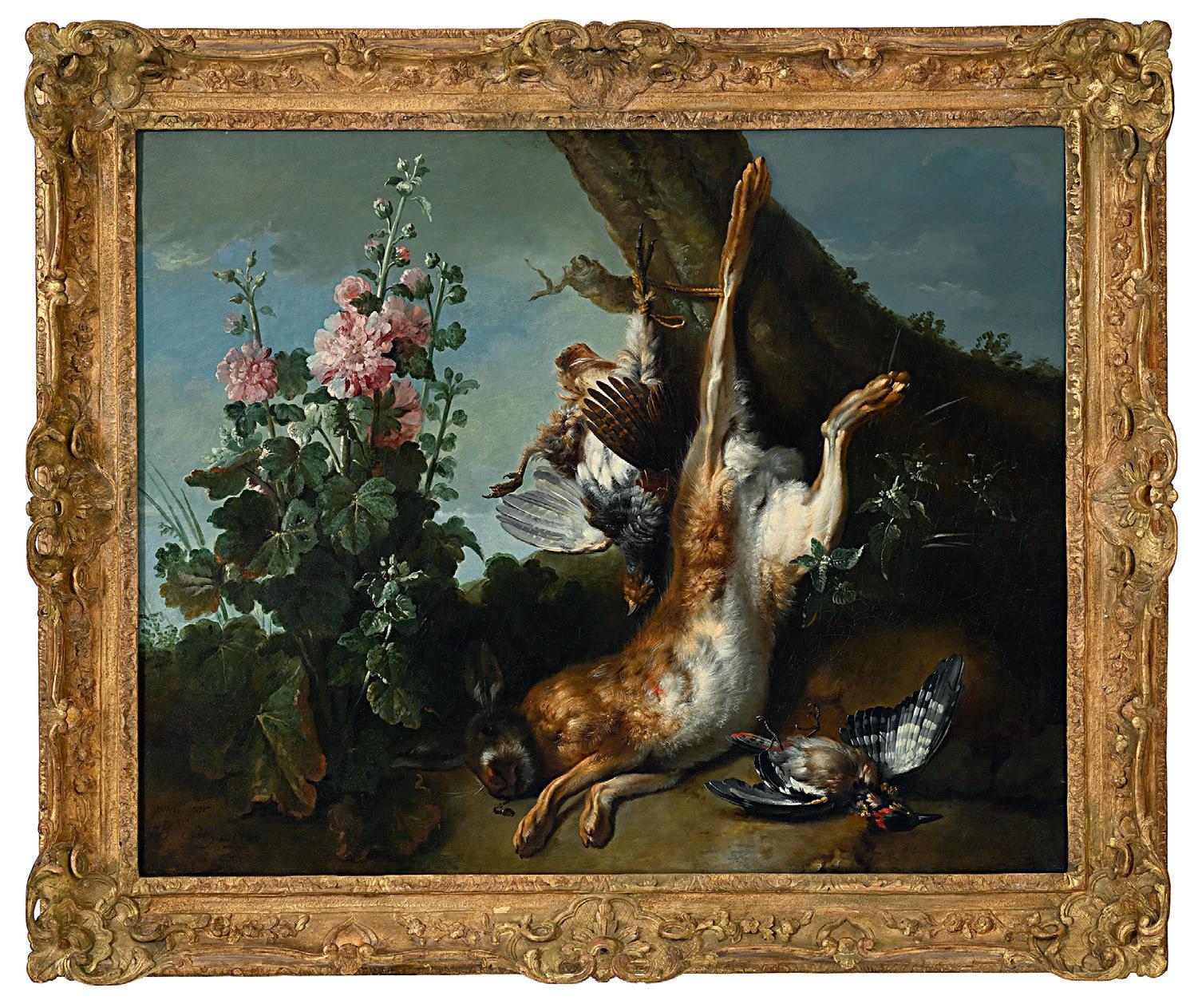 Jean-Baptiste Oudry (1686-1755), Nature morte au trophée de chasse avec un lièvre et perdreaux, 1721, huile sur toile, signée et datée, 81x101,5 cm