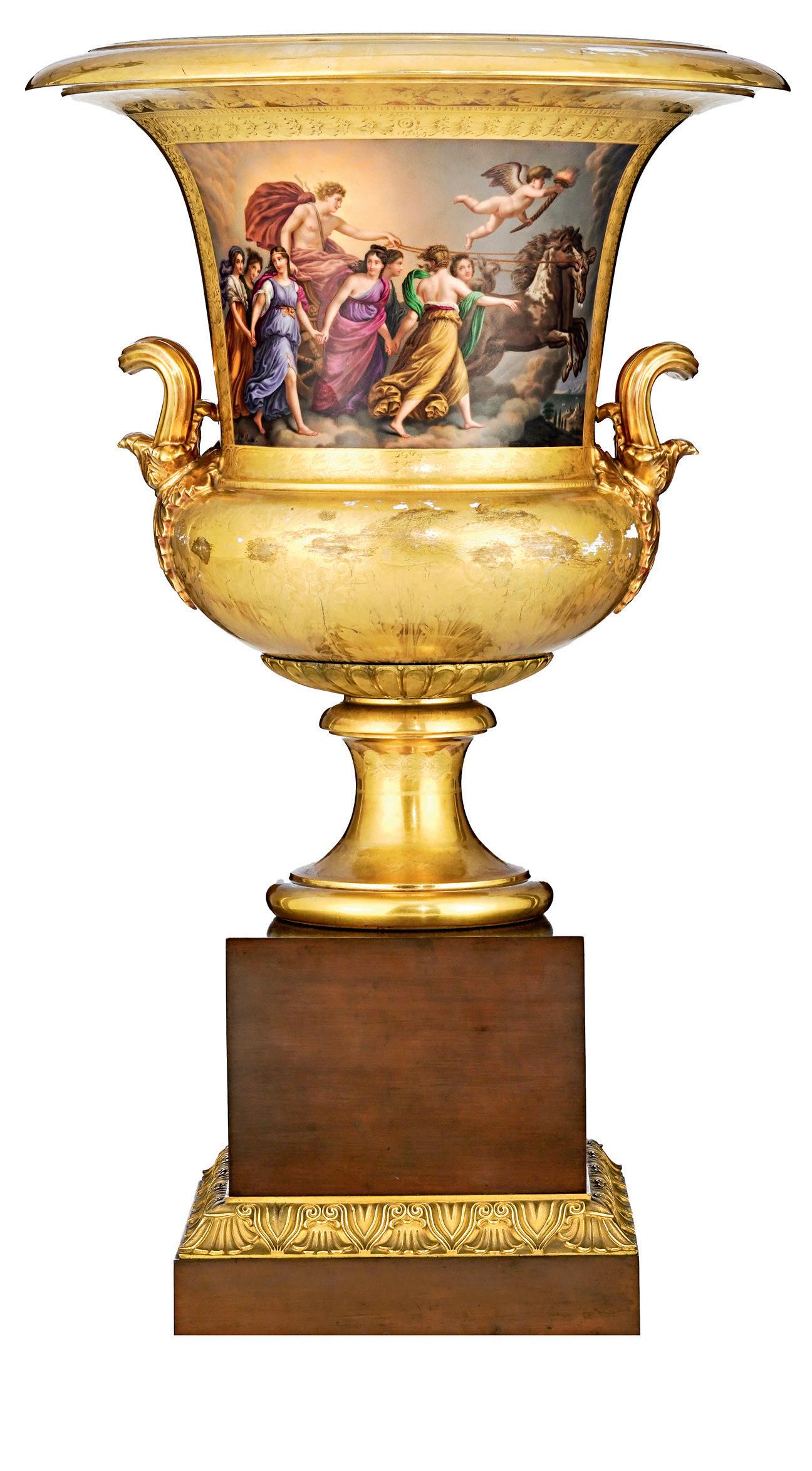 Vase Medici en porcelaine, Manufacture Impériale de Russie, circa 1850, époque Nicolas I, base en bronze, h. 72 cm