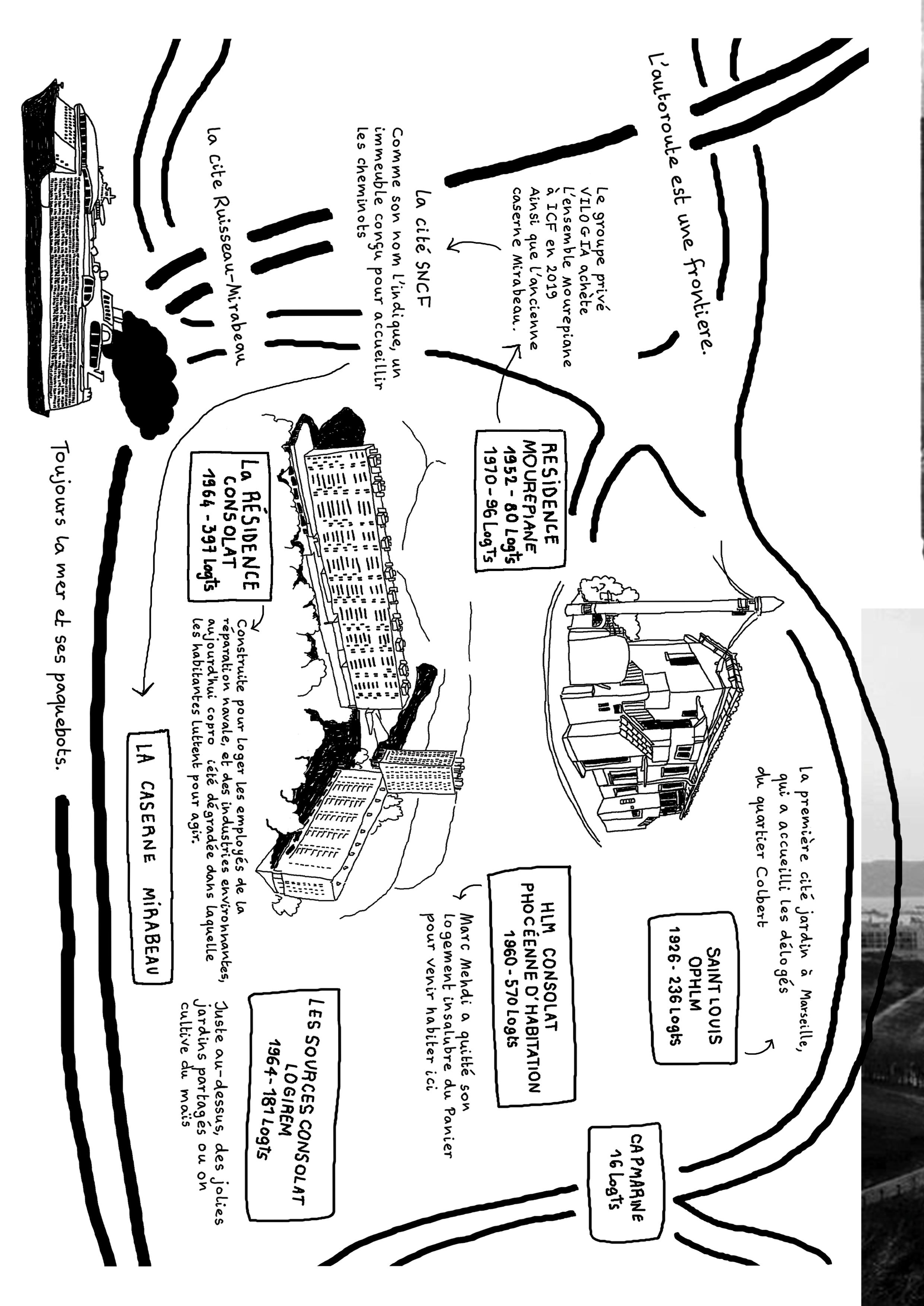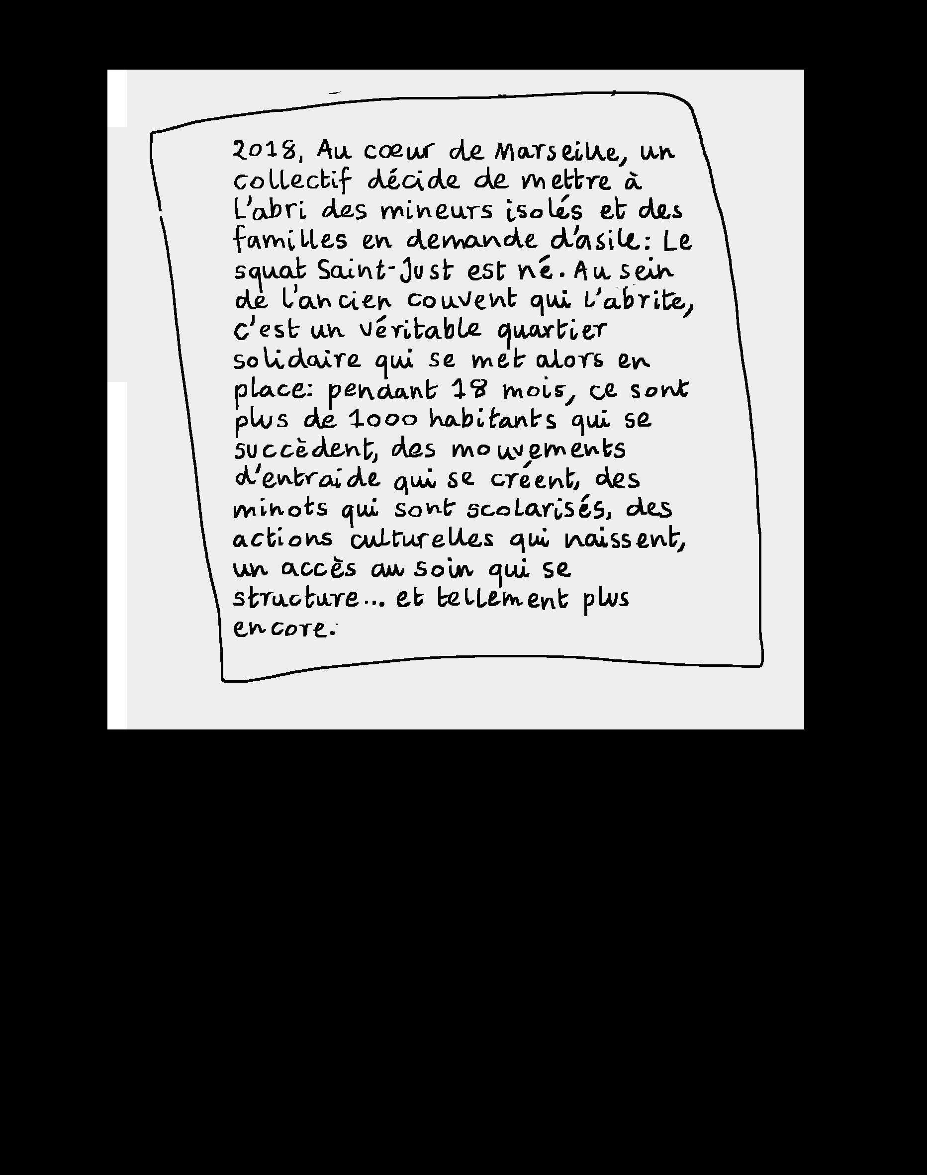 «Sur une de nos balades Mille-Pattes, on est allé fouiller avec Agnès pour trouver l’histoire de l’ancien hôpital Houphouët - Boigny et du bâtiment qui fut à la fois le squat communautaire du Mouvement des squatters et très récemment le squat des familles roms qui auraient dû être accueillies à Saint-Henri dans le “village d’insertion”. Dans le livre d’Etienne Calamai, on a trouvé la photo de l’ancien collège catholique quand il appartenait aux “frères de la Calade».