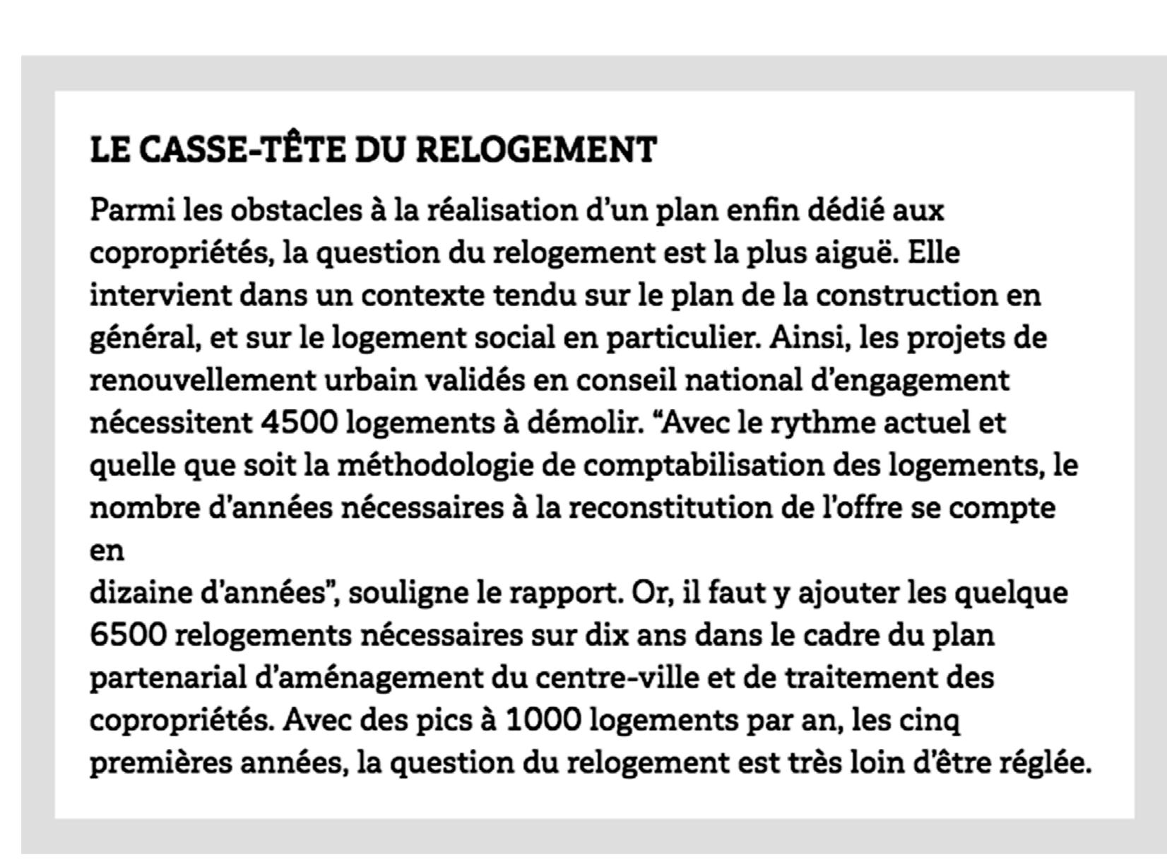 La continuité de défaillances systémiques des dispositifs et des acteurs a laissé de nombreuses marques dans la ville visibles à travers ces cartes : l’accentuation de la fragmentation urbaine, de concentration de la pauvreté dans le centre et les quartiers nord, d’implantation des logements sociaux aggravant une ségrégation géographique, de production insuffisante de logements “ très ” sociaux adaptés aux revenus des demandeur.se.s, d’absence de traitement de l’habitat dégradé dans les quartiers populaires, et, jusqu’aux difficultés de relogement provisoire des ménages évacués du fait du manque de logement social dans le centre ancien (malgré la mise en place d’un dispositif exceptionnel)...