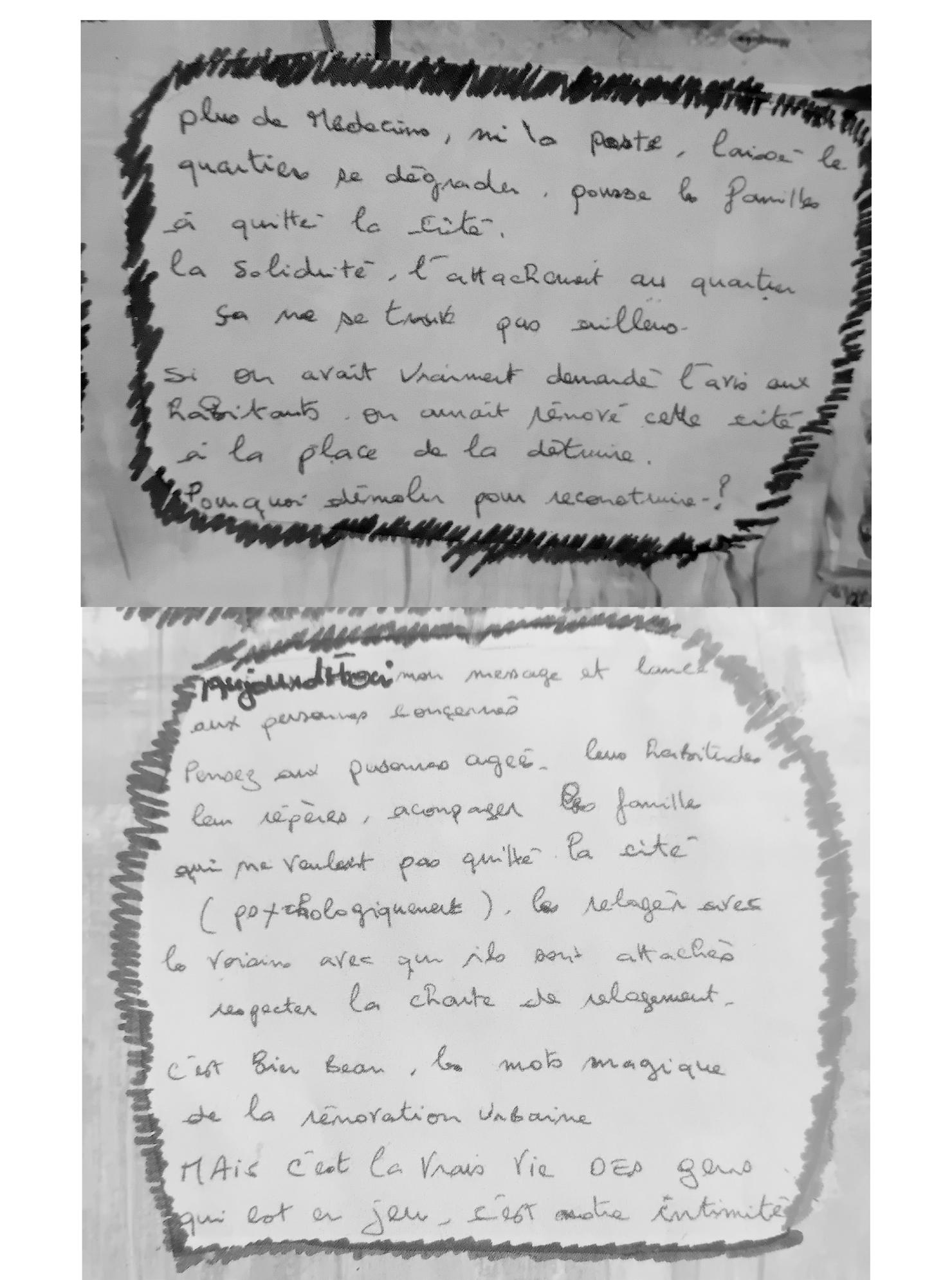 [...] Ces démolitions ne sont pas justifiées. Elles brisent nos vies et nous déracinent, nous qui sommes si heureux et heureuses de vivre dans notre cité. Elles sont une aberration écologique : pourquoi démolir tant de bâtiments, plutôt que réhabiliter et préserver l’existant ? Pourquoi faire passer deux routes, alourdir le bilan carbone, mettre en danger des espèces protégées et abattre des arbres, dans une cité si verte et aérée ? Pourquoi démolir tant de logements, à l’heure où il en manque tant à Marseille, et où les demandes de logements sociaux mettent des années à aboutir ?”