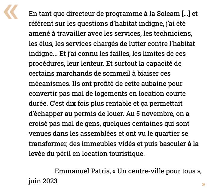 « Le nombre de squats, on le connaît, le nombre de logements vides on le connaît. Parce qu’il y a un suivi avec la préfecture. Comme je l’ai dit, il y a tout un travail avec les institutionnels (…) On est assez interconnecté sur la copropriété. Après, vous avez les marchands de sommeil qui sont identifiés. Et ça les gens peuvent le constater et le comprendre parce que c’est simple vous prenez une population en difficulté et vous leur demandez de payer en liquide. Et eux, ils pensent, ces personnes là, qu’ils payent leur loyer. (…) Quand il y a un squat, c’est simple, on sait qu’on a 48 h pour faire intervenir la police et pour faire déloger les personnes, le syndic il avise tout simplement les propriétaires en leur disant écoutez voilà, on vient de s’apercevoir qu’il y a quelqu’un qui essaie de squatter votre appartement et vous avez tel délai pour faire le nécessaire. (… Après,) notre marge de manœuvre, c’est le tribunal. Il y a des procédures. Ces gens-là, c’est simple, ils sont tous en contentieux, c’est pas des gens qui payent leurs charges. Donc voilà, la finalité c’est saisir leurs biens. Mais ça, il faut des années. Après, si l’Etat décide de changer les lois, ça nous arrangerait. »