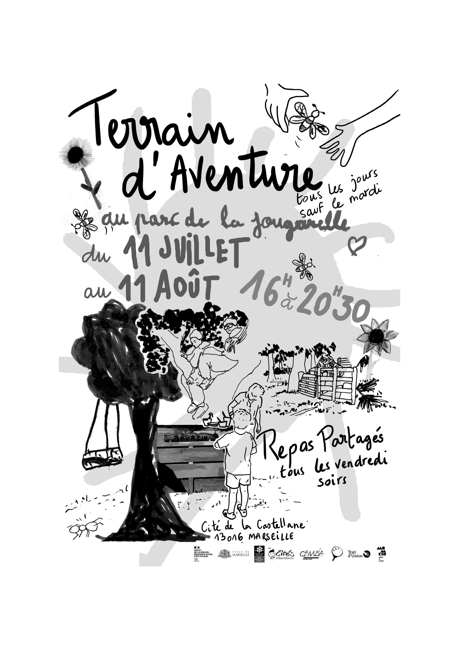 Affiche du Terrain d’Aventure, Juillet 2024 réalisée par les enfants de la Jougarelle et Elsa Menad