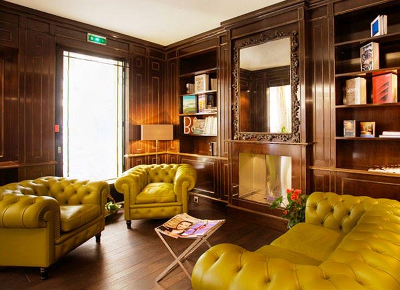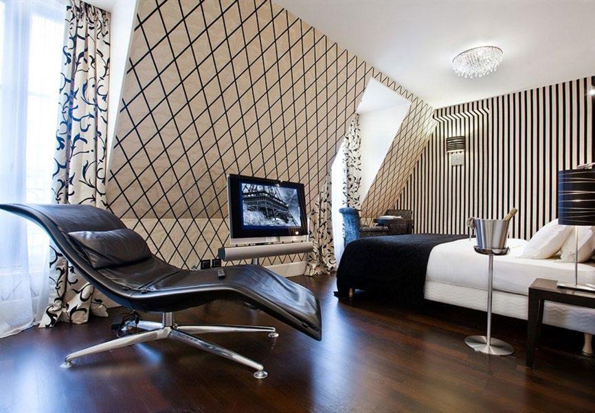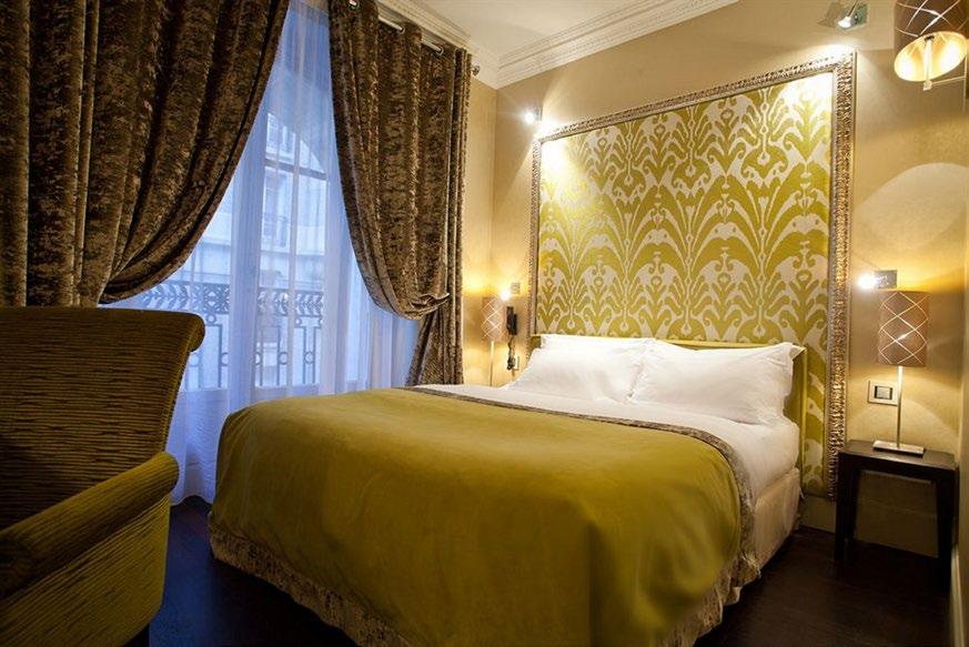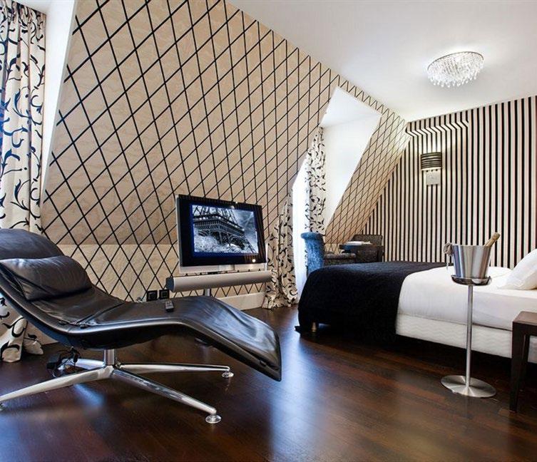The hotel was chosen for its outstanding customer reputation (ranking #32 of 1,809 hotels in Paris on TripAdvisor), and its eclectic, upscale charm. The interiors are an emblem of the best in European design, with furnishings by leading Italian furniture-maker Poltrona Frau, bathrooms clad in Versace tiles, and a range of colour palettes: crim son, teal, gold, silver; used to make each abode distinct.