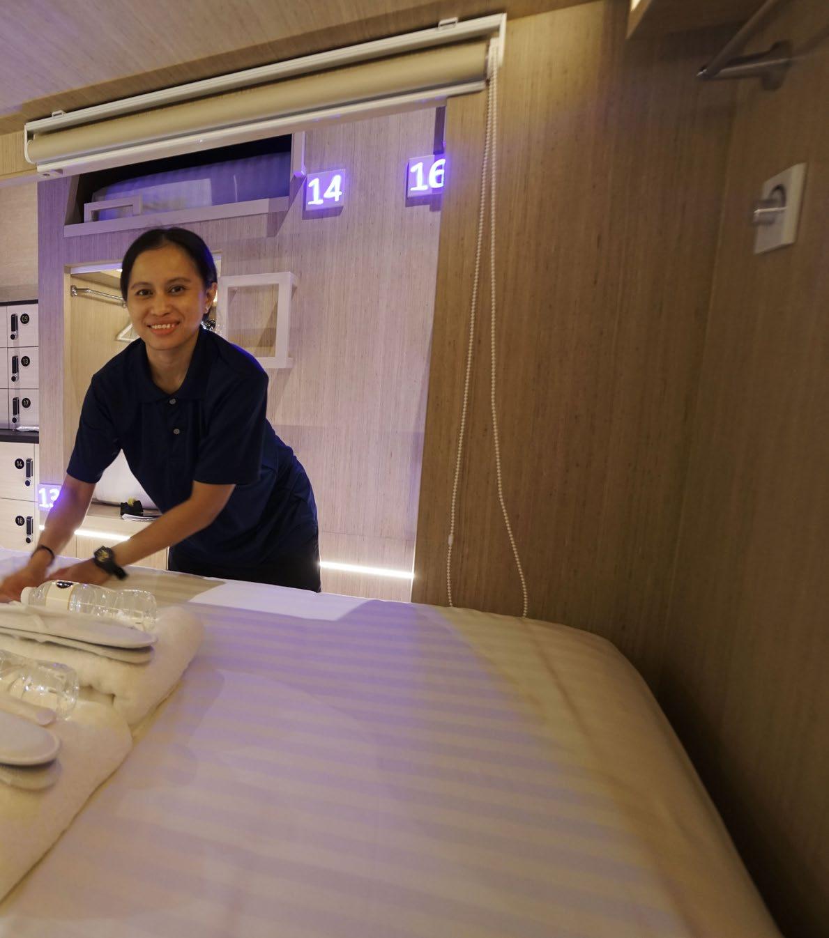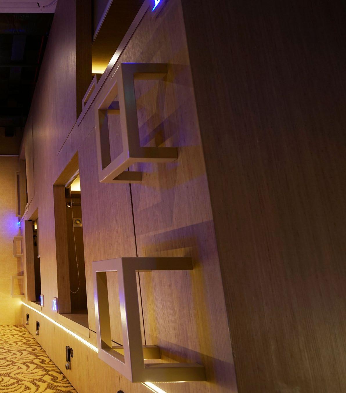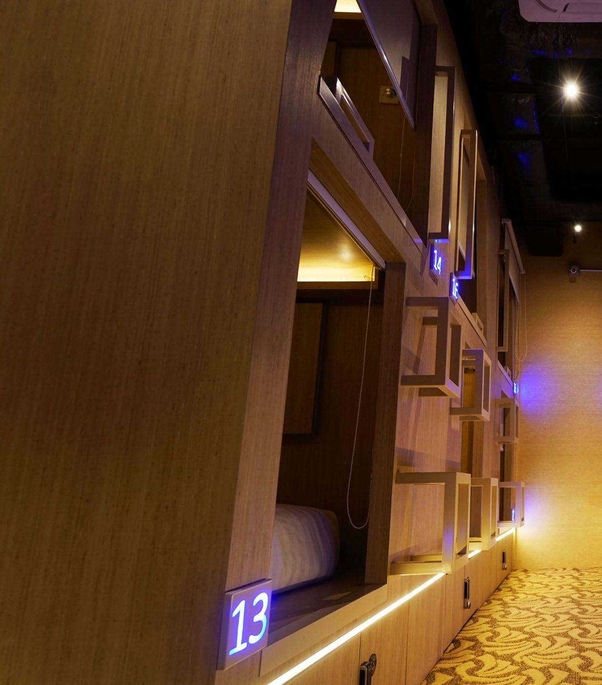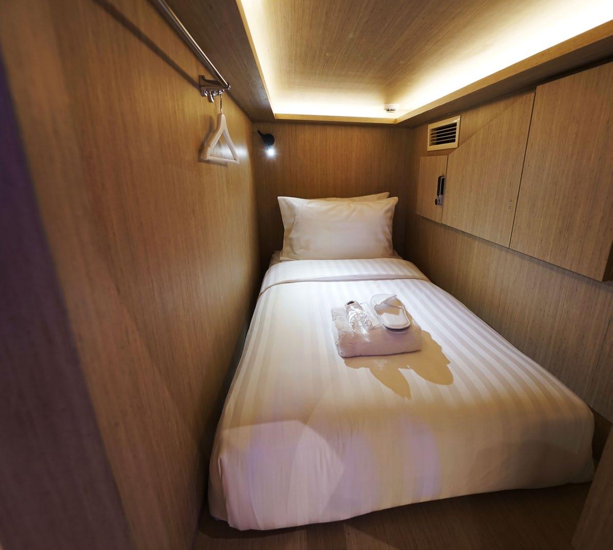 Each unit is equipped with a universal electrical outlet, safe, mirror/vanity area, bedside light, a small space for hanging garments and a locker drawer with digital security for personal storage. Named after the neighbouring streets, room configura tions vary between two and 18 capsules. For an extra level of security and privacy, fema le travellers can choose to stay in the wo men-only rooms. The rooms are pleasantly shaded in soothing pine tones and sturdily sound proofed against the lively sounds of the vicinity. The bathrooms are spacious with standing showers, hairdryer and bath toiletries. Guests are provided with a dental kit, slippers and one towel, upon check-in and this is exchangeable daily. A washing machine with complimentary detergent is also available for guests while work desks are also provided for guests' use.