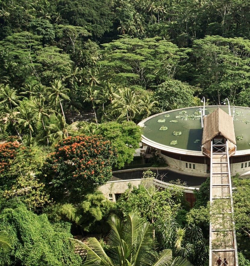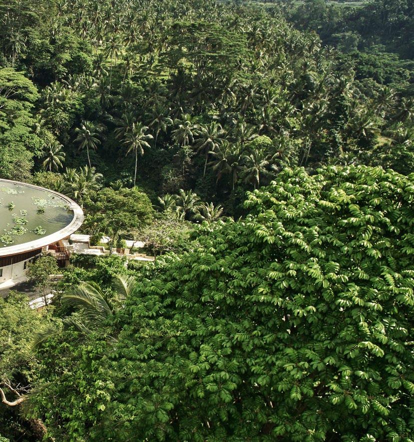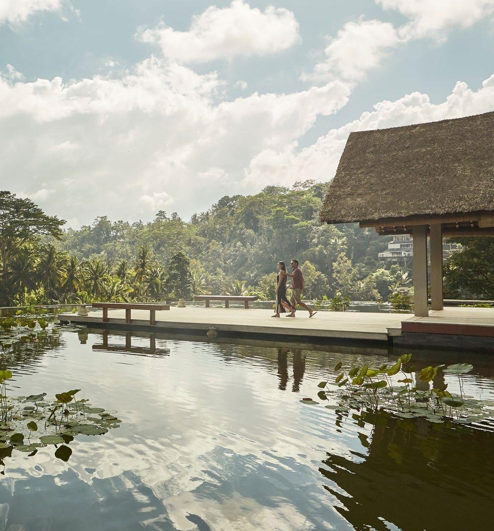 Located in the central highlands of Ubud, Four Seasons Sayan is simulta neously an intimate hideaway nestled between two rivers, and a global ar chitectural icon. Guests make a dra matic entrance via a footbridge high above the treetops, leading to a stun ning rooftop pond from which their descend into the lobby and the resort’s natural paradise.