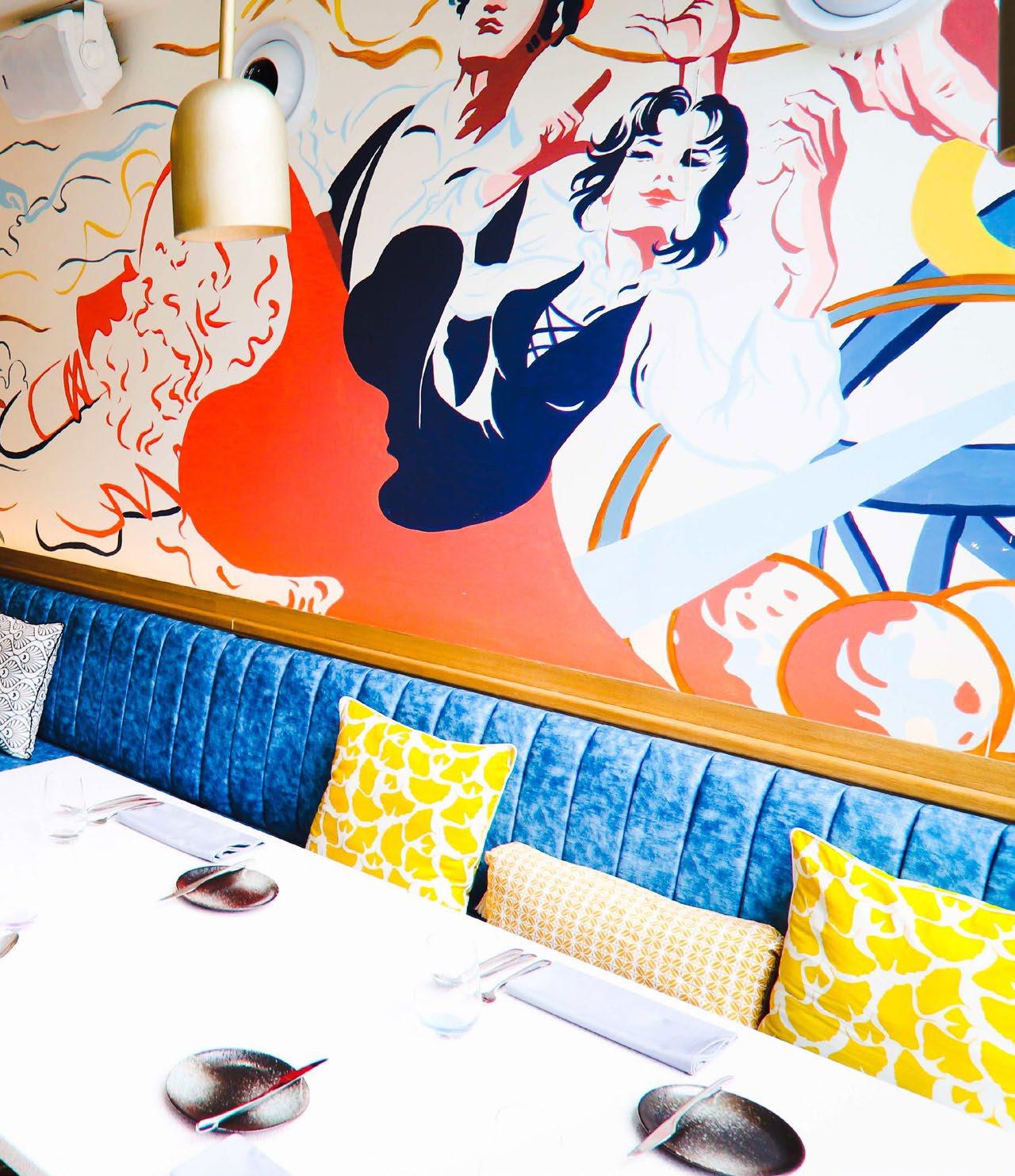 Through the large windows that run along the facade is the res taurant: a warm and authentic French grill.