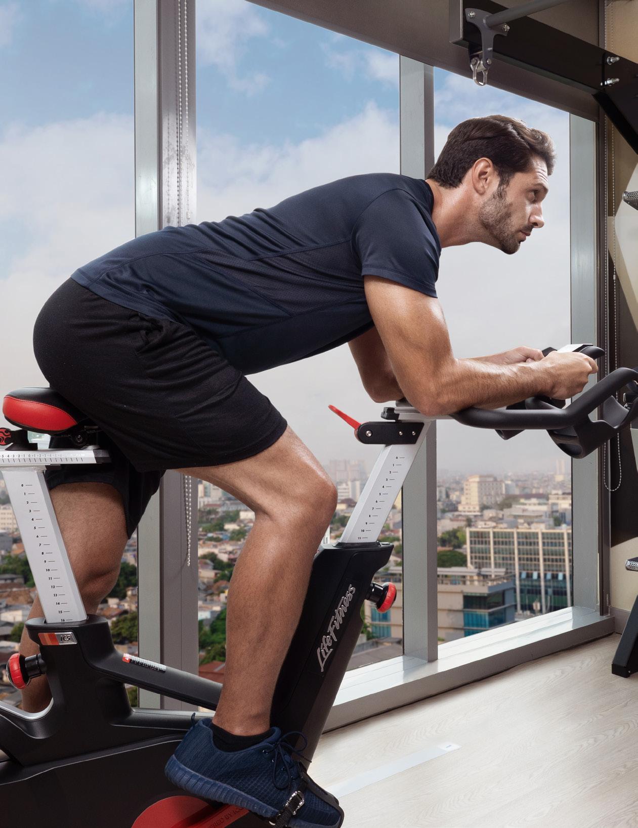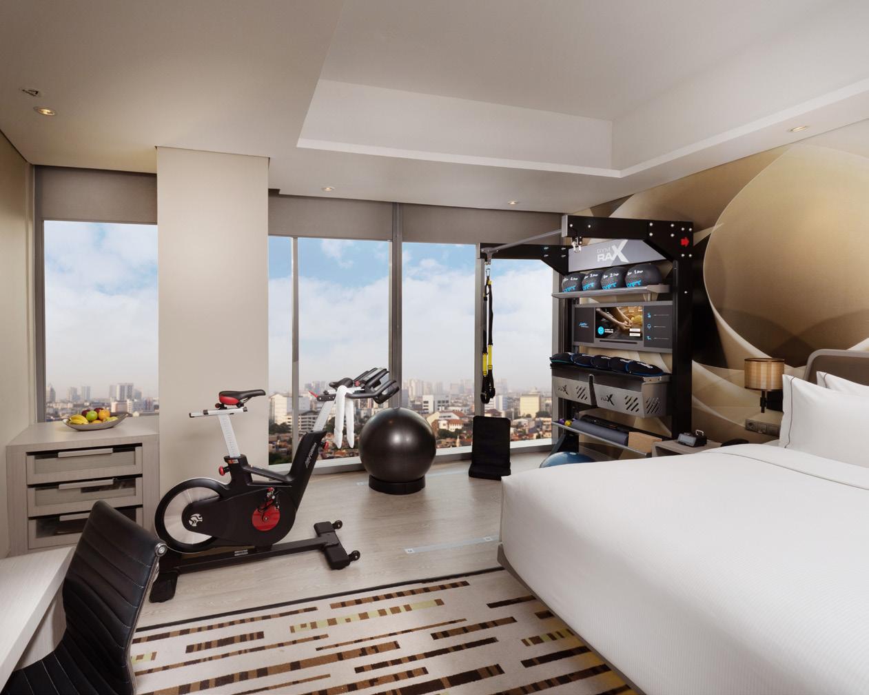 This premium room type offers sports performance materials and bestin-class gym accessories that can be tailored to the many types of fitness needs of the guests. Each room includes an interactive fitness kiosk with more than 200 tutorials and customized workout routines: rang ing from Cardio, Cycling, Endurance, Strength, High Intensity Interval Training (HIIT), Yoga, Stretch and Recovery, Meditation, Wheelchair + Partner and Low Intensity Training. The room also features an indoor spin bike that is used for either longer ‘indoor-cycling’ type exercise sessions or focused interval training workouts. A functional training station is available, providing apparatus and accessories that deliver unlimited strength, core, suspension and HIIT style workouts to Ratrie Tathia JakartaDiponegoro.DoubleTree.comballs, exercise ball, yoga mat and therapeutic accessories. In addition, the room also offers wellness extras such as meditation chair, blackout shades for restorative sleep and hydration beverage option.