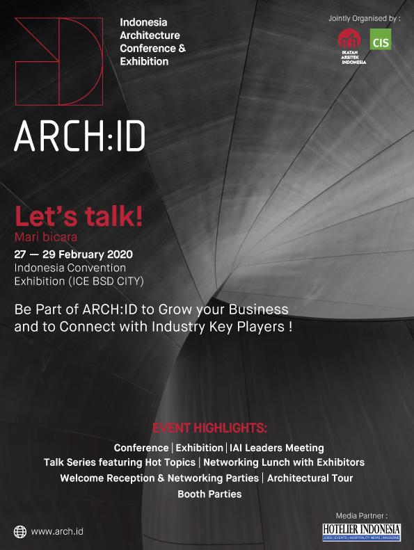 Architectural Event, ARCH:ID Conference and Exhibition which will be held from 27 – 29 February 2020 at the Indonesia Convention Exhibition (ICE) BSD City –Tangerang. The theme for this event is “Let’s Talk – Mari Bicara”. This 3-days Event will be packed with Conference, Exhibition, Leaders Meeting, Networking, Talk Series, Awarding and many more.