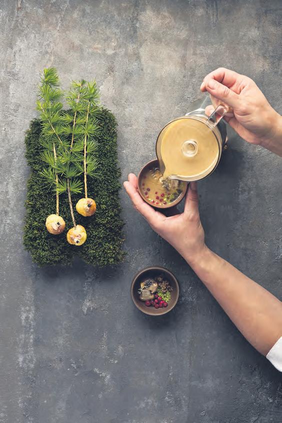 ture (FAO) en 2022. «Chaque aliment a une histoire, un territoire, u ne saison, que j’évoque avant de servir les plats.» Ses menus à thèmes se nomment ainsi Flora elvetica ou Rätien et racontent cette région prodigue de beautés, à travers toute la gamme de nos perceptions, les Alpes, la vallée, chaque mets étant associé à une boisson, avec ou sans alcool. Le pinot noir implanté dès l’époque romaine dans les Grisons lui inspire notamment un plat associant le cassis au cépage, proposé avec une kombucha à base des raisins de pinot séchés.