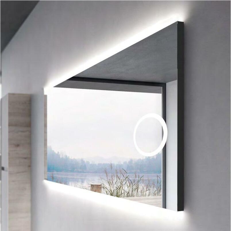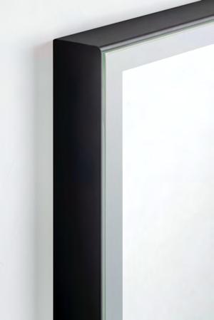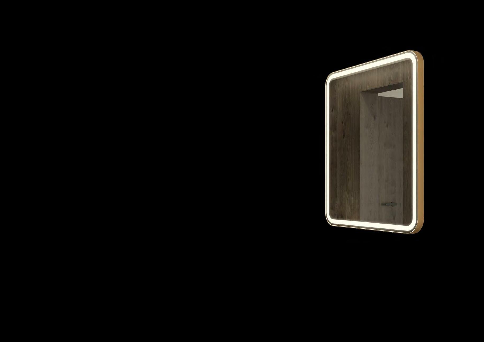 Square and rectangular mirrors with an extruded aluminum frame and integrated LED.