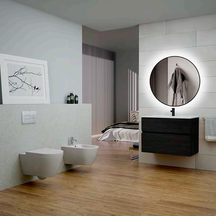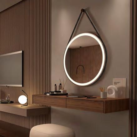 Round mirrors with a decorative faux-leather strap to simulate a suspension effect Direct lighting through perimetral sandblasting.