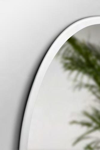 Organic mirrors with an edge screen-printed frame in different colors. Frameless, and smoothly polished edges to create a “free-floating effect" on the wall.